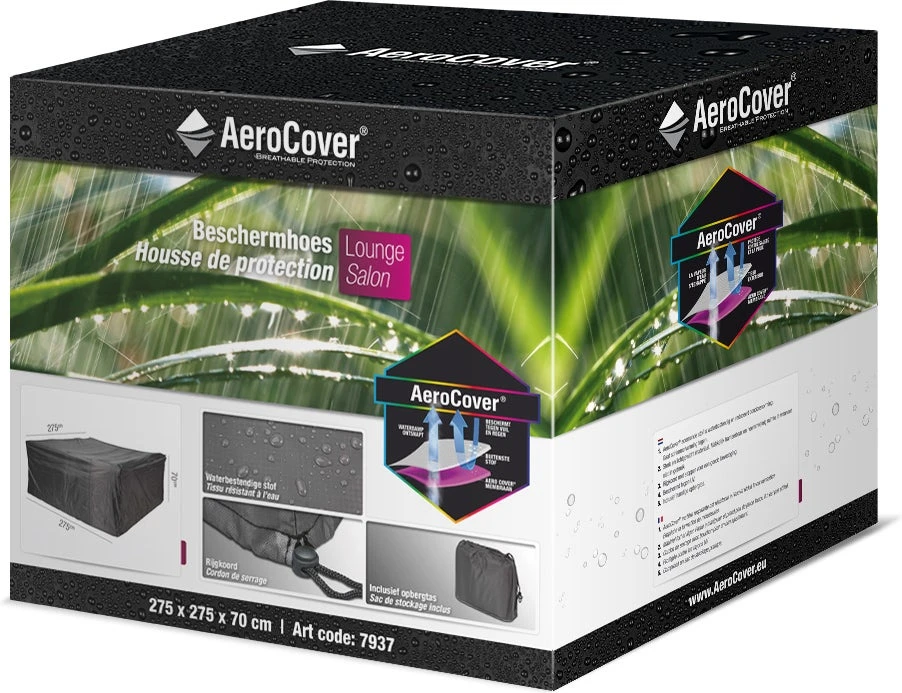 Aerocover loungesethoes, beschermt uw loungeset tegen vuil en regen! Aerocover is gemaakt van sterk, lichtgewicht ripstop polyester en is makkelijk hanteerbaar en neemt weinig ruimte in. Deze Aerocover loungesethoes is voorzien van een rijgkoord met stopper voor een goede bevestiging.