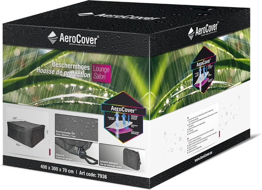 Aerocover loungesethoes, beschermt uw loungeset tegen vuil en regen! Aerocover is gemaakt van sterk, lichtgewicht ripstop polyester en is makkelijk hanteerbaar en neemt weinig ruimte in. Deze Aerocover loungesethoes is voorzien van een rijgkoord met stopper voor een goede bevestiging.