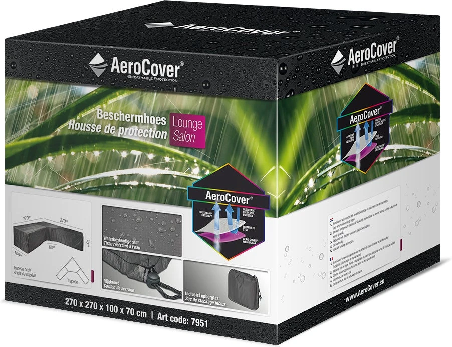 Aerocover loungesethoes rechts, beschermt uw loungeset tegen vuil en regen! Aerocover is gemaakt van sterk, lichtgewicht ripstop polyester en is makkelijk hanteerbaar en neemt weinig ruimte in. Deze Aerocover loungesethoes is voorzien van een rijgkoord met stopper voor een goede bevestiging.