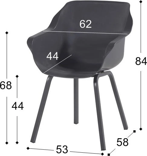 Kuipstoel Sophie Element heeft de afmetingen 59 x 62 x 84 cm en is verkrijgbaar in diverse kleuren. Zithoogte 44 cm, 5 jaar garantie.