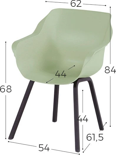 Eettafelstoel Sophie Element heeft de afmetingen 59 x 62 x 84 cm en heeft een zithoogte van 44 cm, 5 jaar garantie.