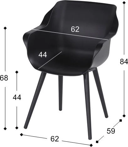 Kuipstoel Sophie Studio heeft de afmetingen 59 x 62 x 84 cm. Zithoogte 44 cm, 5 jaar garantie.