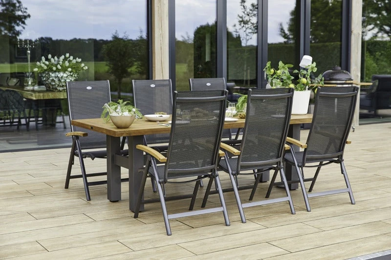 De Aruba standenstoel van Hartman is een tijdloze aanwinst door het strakke en stijlvolle design. Tuinstoel Aruba heeft een sterk aluminium frame wat de stoel lekker licht van gewicht maakt. De comfortabele textileen zitting is uitgevoerd in de kleur antraciet en is aan de hand van de leuning gemakkelijk te verstellen naar de gewenste stand. Dit zorgt voor een optimaal zitcomfort en maakt deze tuinstoel ideaal om ontspannen te kunnen tafelen. Als je bent uitgegeten zet je gewoon de rugleuning naar achteren en uitbuiken maar! De armleuningen geven de stoel een stoere robuuste finishing touch en zijn gemaakt van 100% goedgekeurd FSC teakhout.