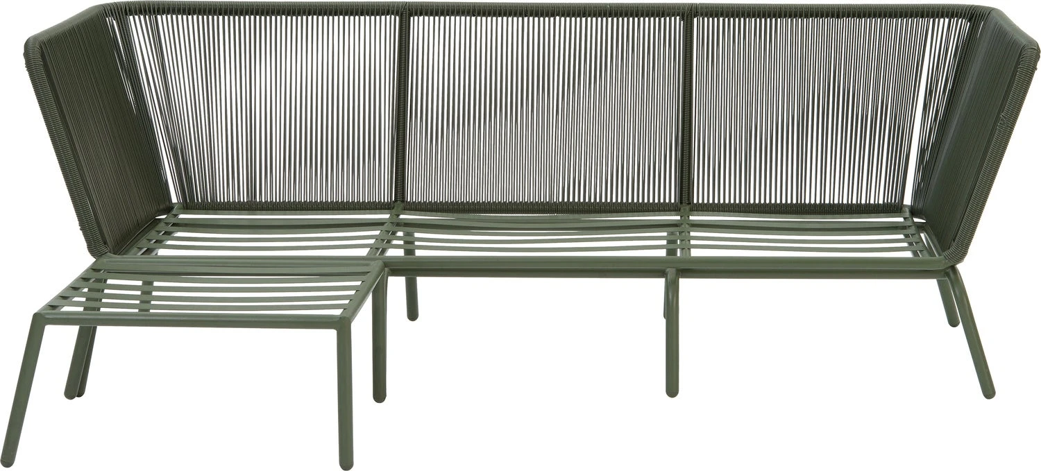 Loungebank Iris staat leuk in ieder soort tuin door het decoratieve design met hoge leuningen en de wicker draadconstructie. Het stalen frame is afgewerkt met een beschermende poedercoating in legergroen en steekt mooi af bij de wicker draden met touwlook die deze toffe 3-zits loungebank van een natuurlijke uitstraling voorzien.