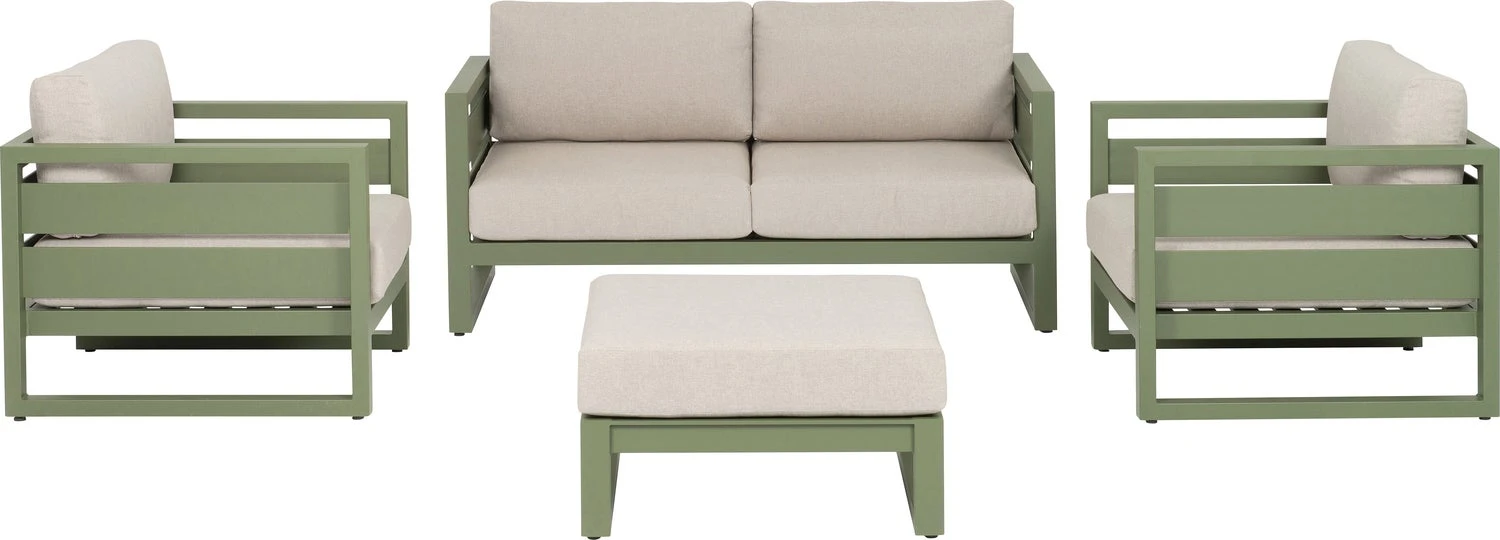 De Norma blokset van Intratuin is een strakke 4-persoons loungeset gemaakt van hoogwaardig aluminium in stoer legergroen. Aluminium is modern en lekker licht in gewicht en kun je met de seizoenen verplaatsen, terwijl hout een natuurlijke uitstraling heeft en steeds grijzer wordt van kleur. Met dikke kussens verzacht je de stoere look van je tuinmeubelen.