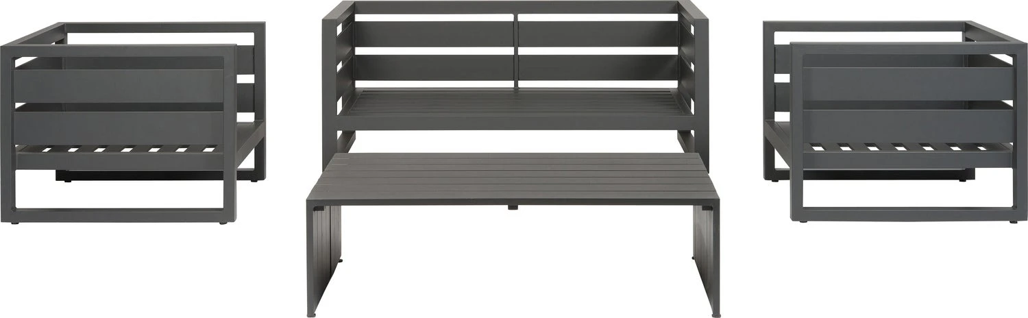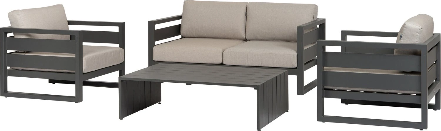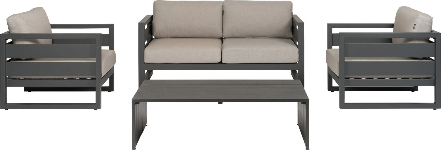 De Norma blokset van Intratuin is een strakke 4-persoons loungeset gemaakt van hoogwaardig aluminium in stoer antraciet. Aluminium is modern en lekker licht in gewicht en kun je met de seizoenen verplaatsen, terwijl hout een natuurlijke uitstraling heeft en steeds grijzer wordt van kleur. Met dikke kussens verzacht je de stoere look van je tuinmeubelen.