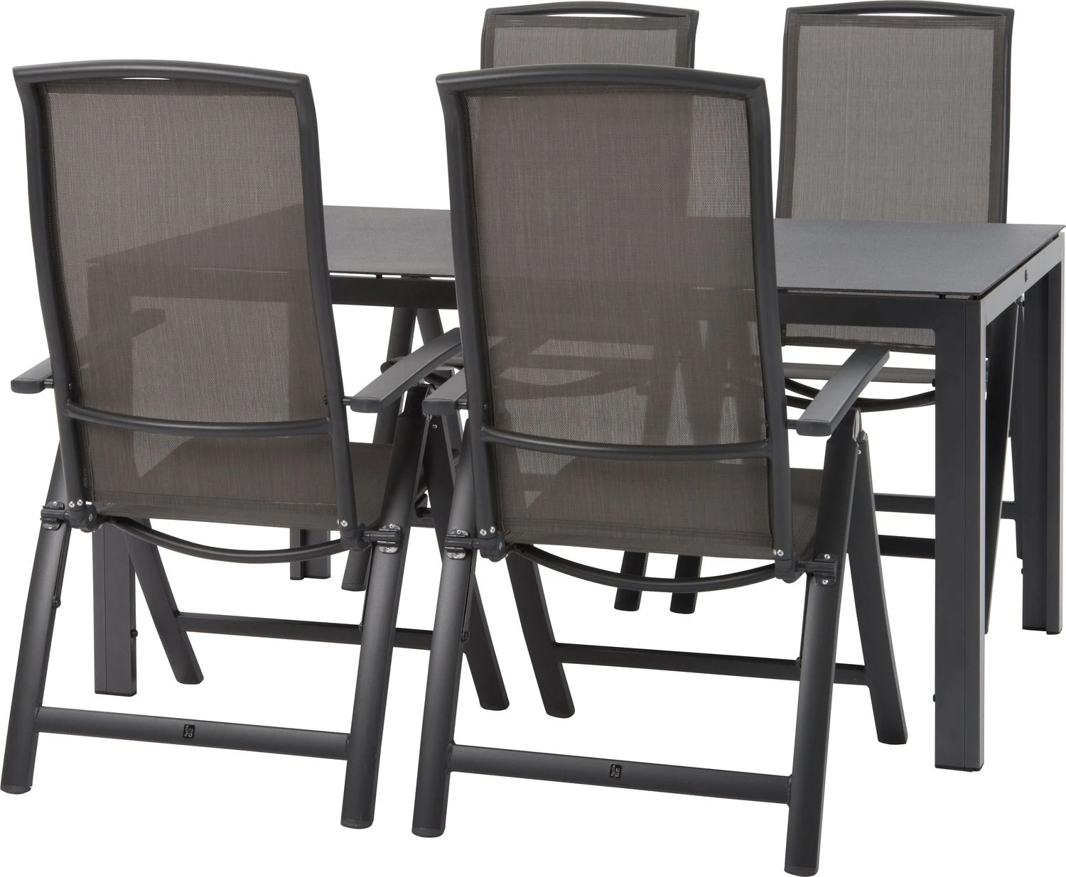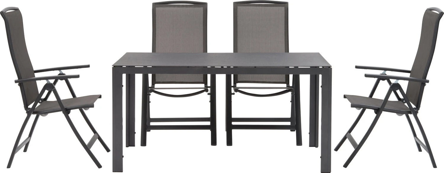 Met deze Bea en Haikou diningset van Intratuin kies je voor een tijdloze blikvanger voor tuin en terras. Tuintafel Bea is strak vormgegeven en heeft een aluminium onderstel met een spraystone tafelblad in de kleur donkergrijs wat zorgt voor een moderne look. Spraystone is een mix van imitatie kunststof dat is aangebracht op veiligheidsglas. Dit maakt dat er een duurzaam en slijtvast tafelblad ontstaat dat niet te zwaar is, maar qua uiterlijk niet onderdoet voor natuursteen. Hoe fijn is dat! In combinatie met de verstelbare Haikou diningstoel vormt dit de perfecte aanwinst om lekker lang buiten te genieten.