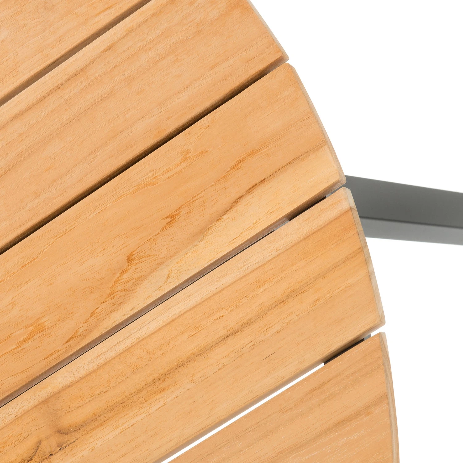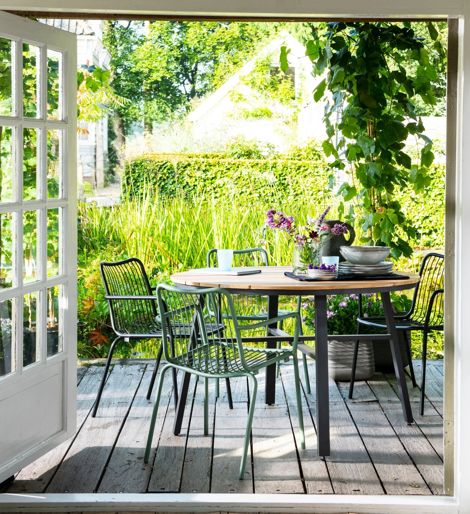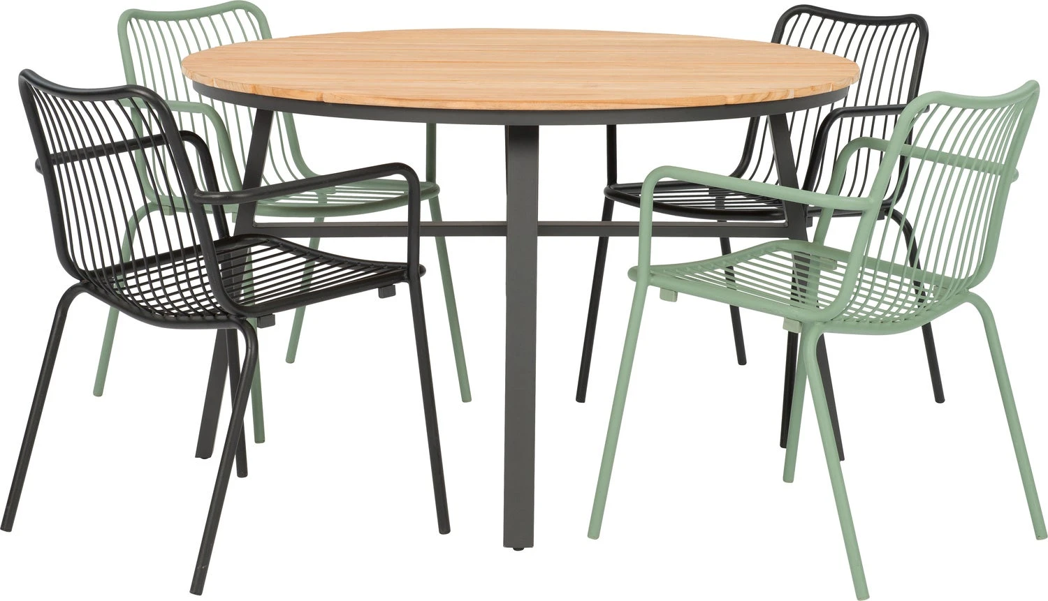 Eettafel Flore heeft een onderstel van aluminium dat is afgewerkt met een beschermende poedercoating in de kleur antraciet en een rustiek tafelblad vervaardigd uit duurzaam Teak in de kleur naturel waardoor er een mooi contrast ontstaat. De stalen Xavi draadstoelen in de mixkleuren mat zwart met mat groen hebben een open karakter en geven een luchtige uitstraling op het terras wat deze tuinset ook zeer geschikt maakt voor een knusse stadstuin, patio of dakterras. En nog fijner is dat de tuinstoelen stapelbaar zijn waardoor je ze op winterdag zo weer hebt opgeborgen.