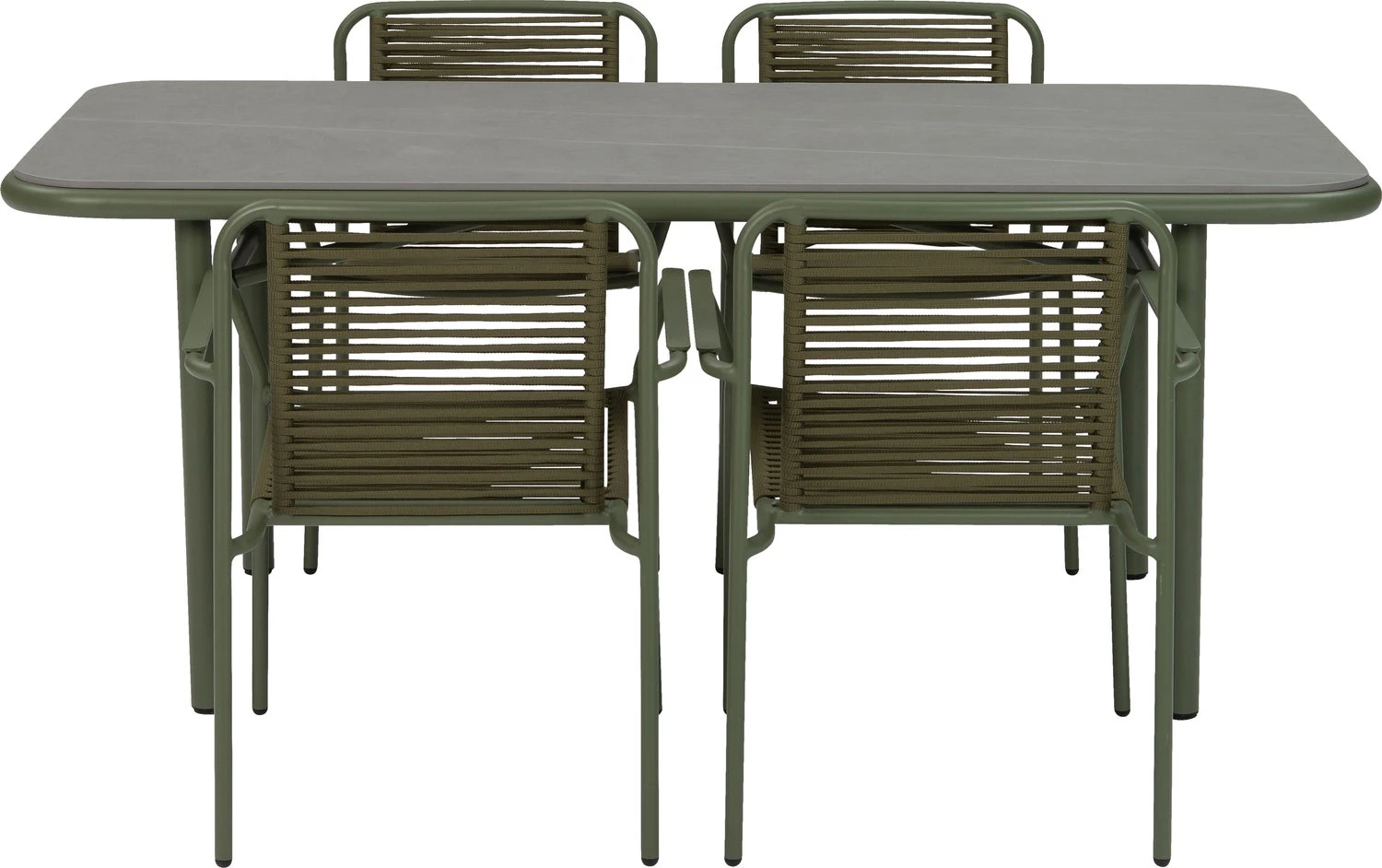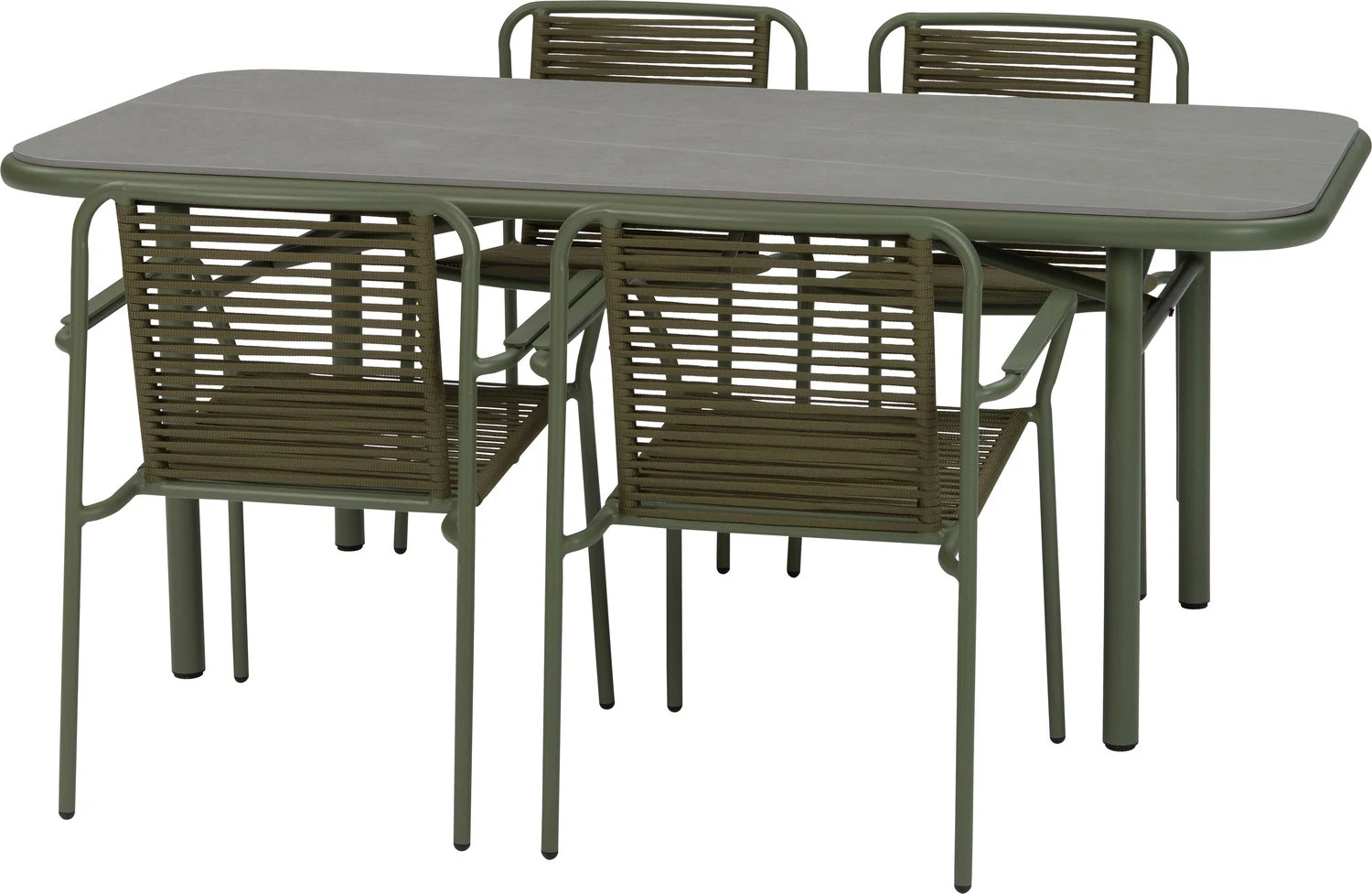 Met deze Jasmijn diningset van Intratuin kies je voor een tijdloze blikvanger voor tuin en terras. Tuintafel Jasmijn is strak vormgegeven en heeft een aluminium onderstel in de kleur legergroen met een gesinterde kunststof tafelblad van 11 mm in de kleur grijs, wat zorgt voor een moderne en stoere look. Doordat het tafelblad gemaakt is van kunststof is deze tafel onderhoudsvrij. Als er iets gemorst word op de tafel, laat dit geen vlekken achter. Maar doordat het tafelblad gesinterd is, lijkt het qua uiterlijk op natuursteen.