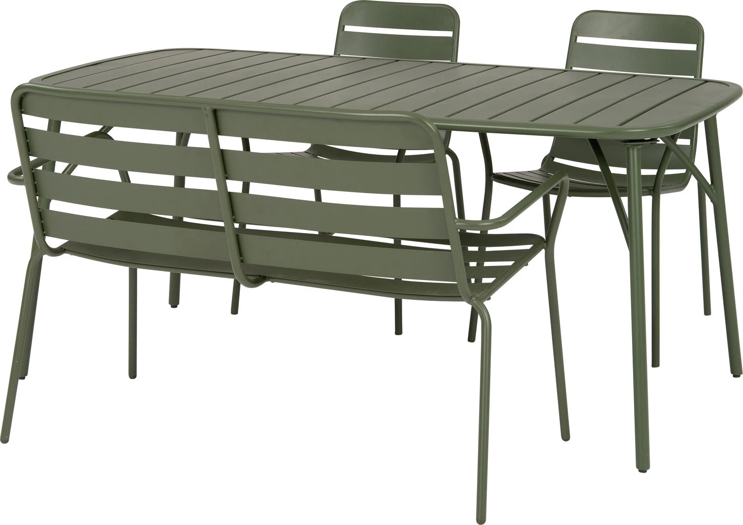 Diningset Olle is 4-delig en bestaat uit eettafel Olle, afmetingen 150 x 37 x 42,5 cm, een 2-persoons tuinbank 115 x 62,8 x 82 cm en twee eettafelstoelen, afmetingen 55,7 x 62,8 x 82 cm. Zithoogte 44,8 cm, 2 jaar garantie.