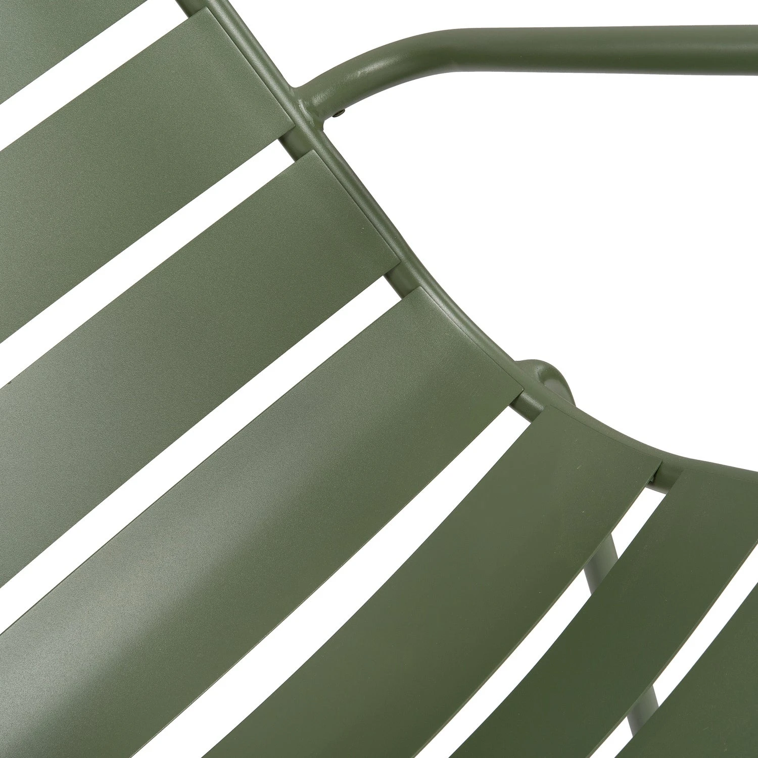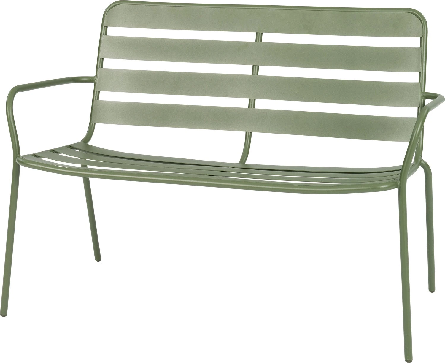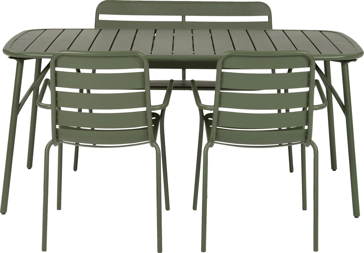 De tuinbank en tuinstoelen kenmerken zich door hun stoere stalen design en knusse formaat. De meubels zijn gemaakt van staal dat afgewerkt is met een beschermende poedercoating in stoer legergroen. Hierdoor zijn water en vuil gemakkelijk afneembaar. De meubels zijn licht in gewicht en dat maakt het bovendien gemakkelijk om te verplaatsen.