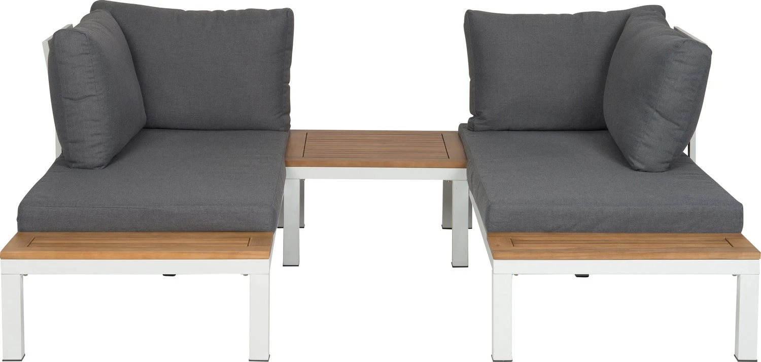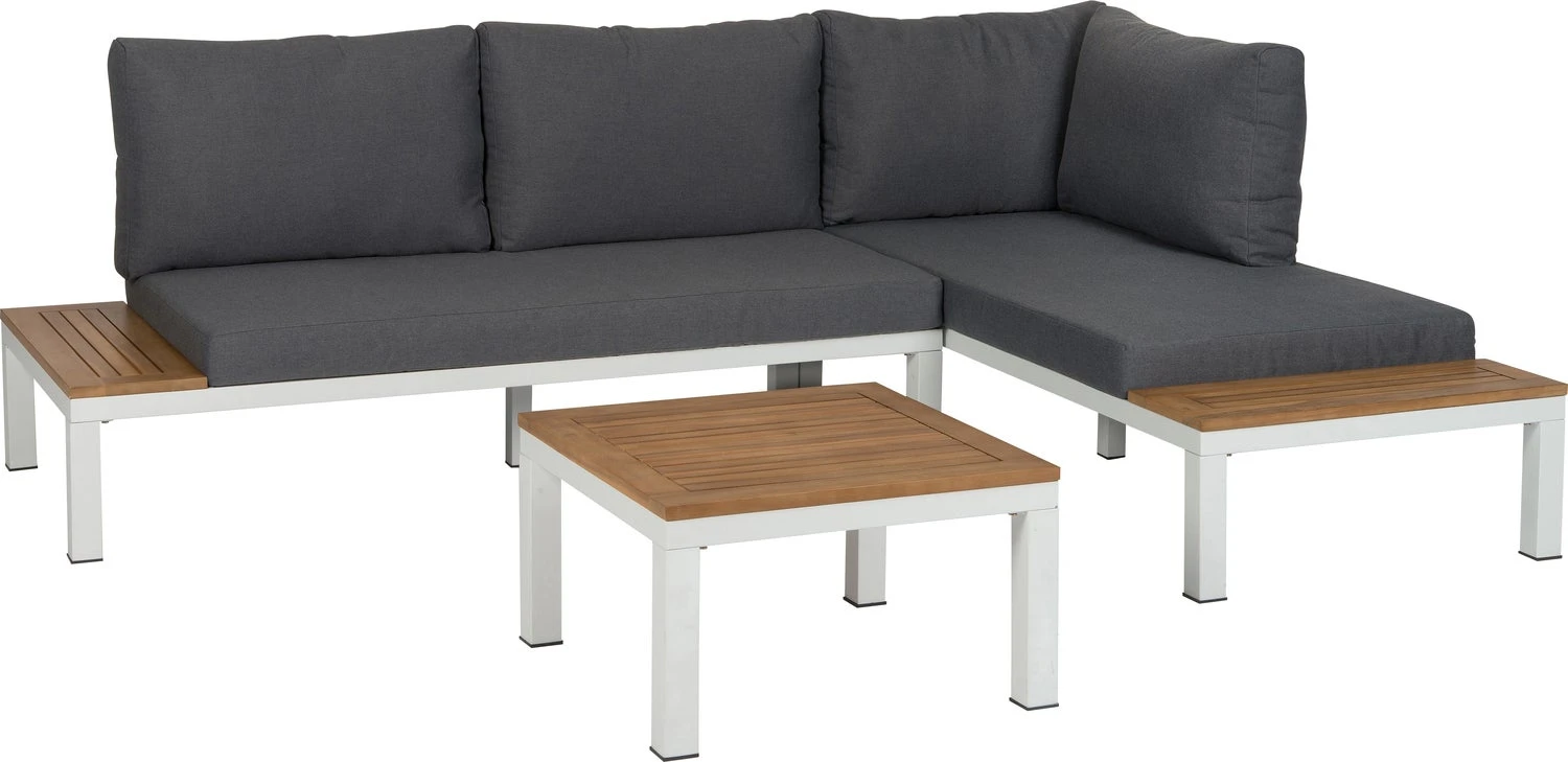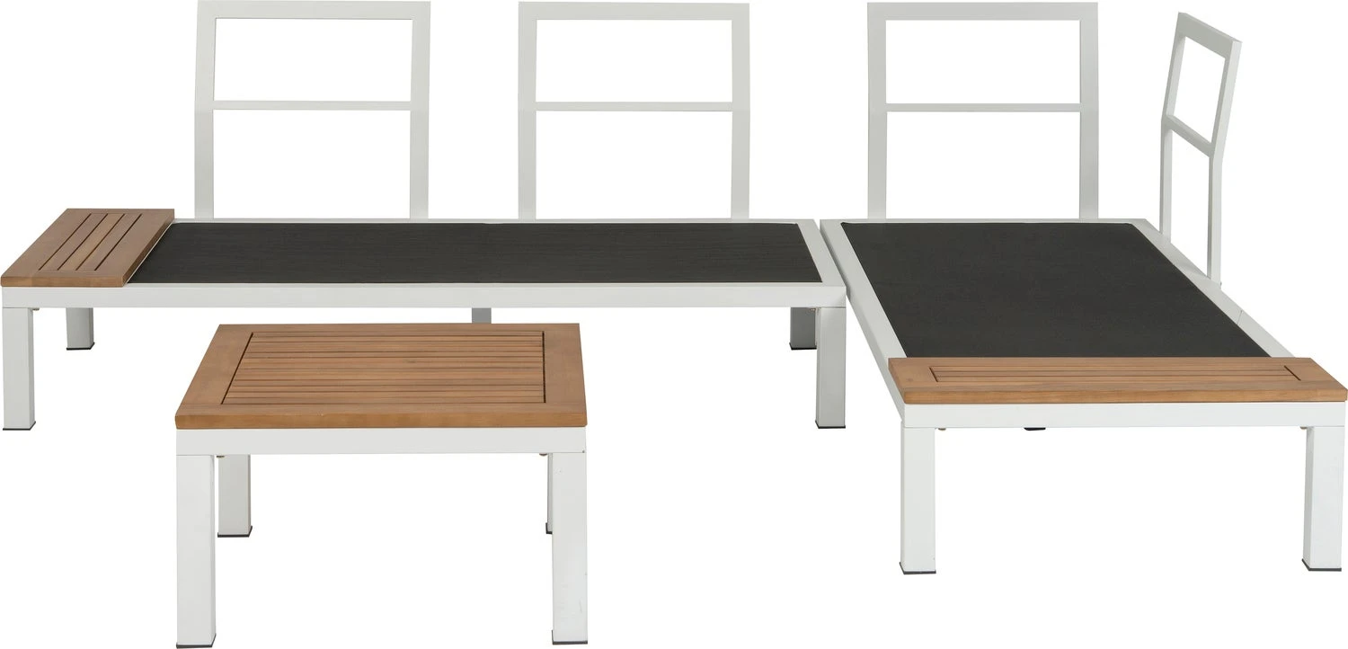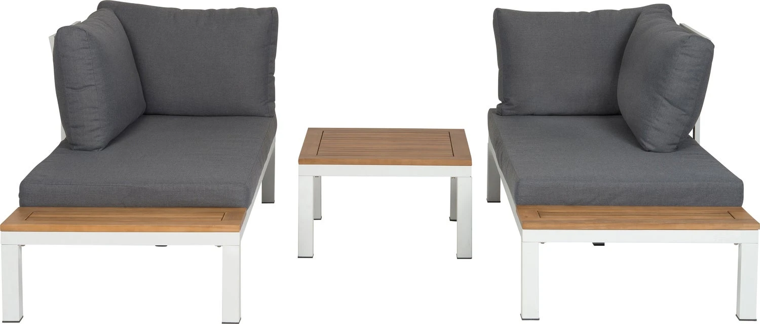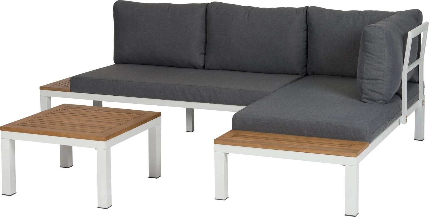 Loungeset Guava is 3-delig en bestaat uit een bank links, afmetingen 160 x 76 x 73 cm, een bank rechts, afmetingen 160 x 76 x 73 cm en een koffietafel, afmetingen 60 x 60 x 32,5 cm. De set heeft een zithoogte van 27 cm en is eenvoudig zelf te monteren aan de hand van de meegeleverde instructies. 2 jaar garantie.