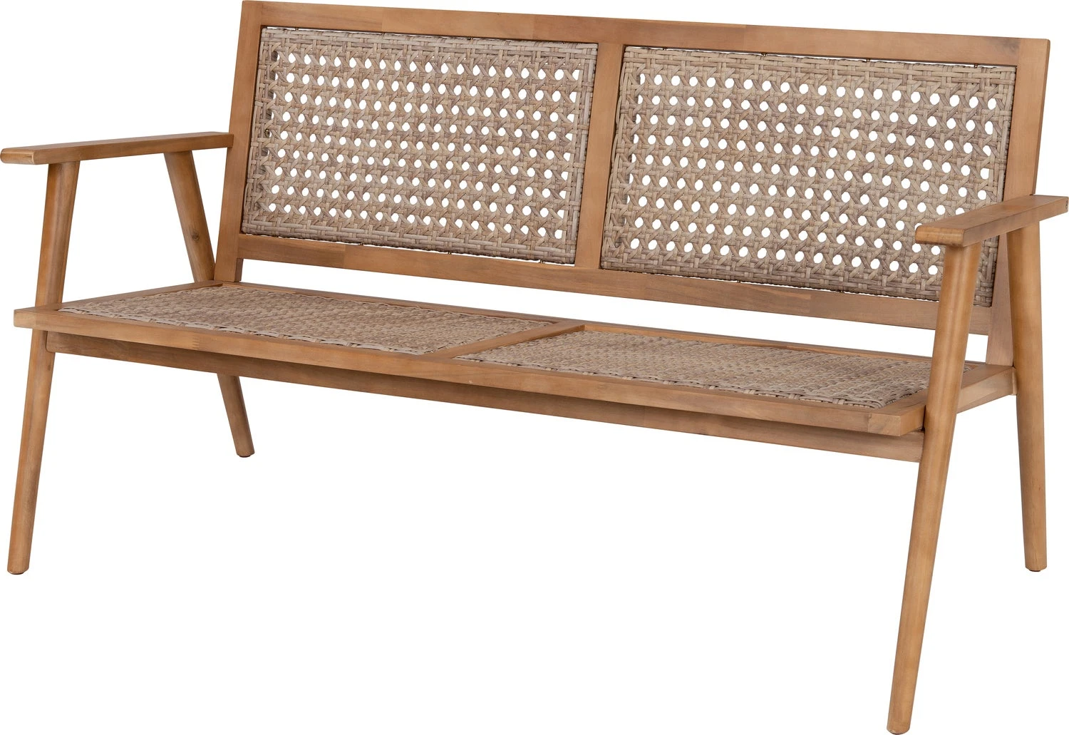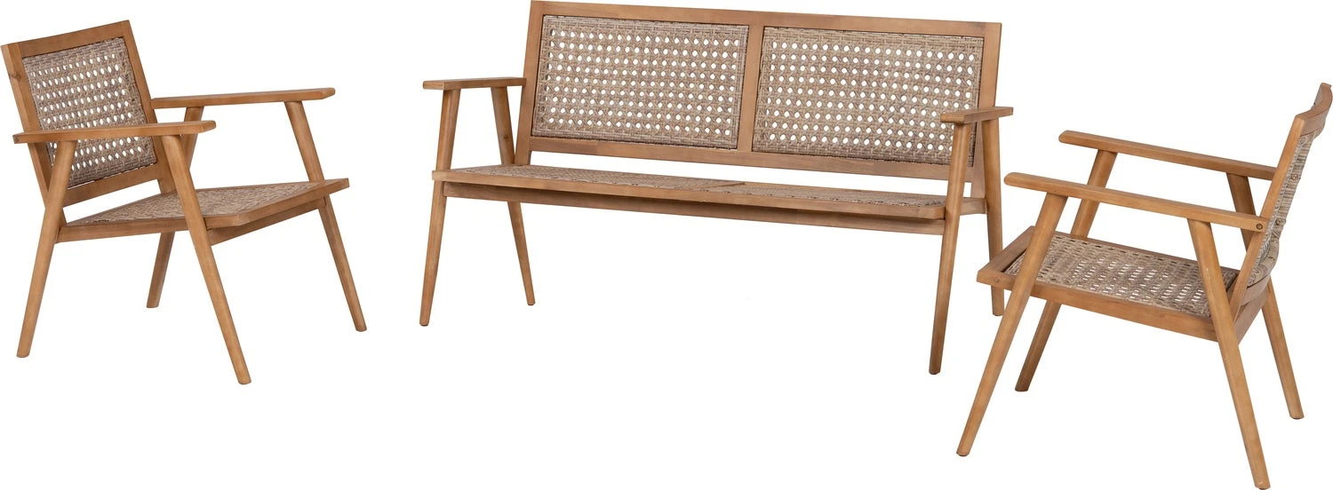 De Komodo loungeset van Intratuin is gemaakt van 100% FSC gecertificeerd acaciahout dat is voorzien van een luxe teaklook in warm naturel. De zitting en rugleuning zijn in vogeloog patroon geweven van 7 mm plat wicker in een lichte kleur naturel wat zorgt voor een unieke twist.