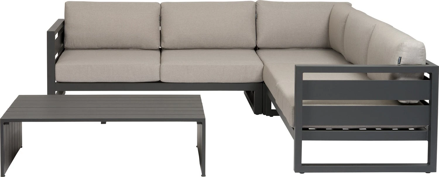 De Norma loungeset van Intratuin is een strakke 4-persoons hoekset gemaakt van hoogwaardig aluminium in stoer antraciet. Aluminium is modern en lekker licht in gewicht en kun je met de seizoenen verplaatsen, terwijl hout een natuurlijke uitstraling heeft en steeds grijzer wordt van kleur. Met dikke kussens verzacht je de stoere look van je tuinmeubelen.