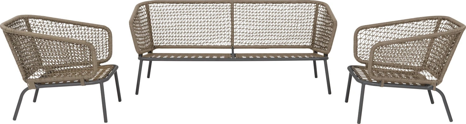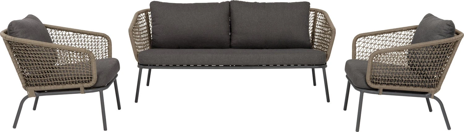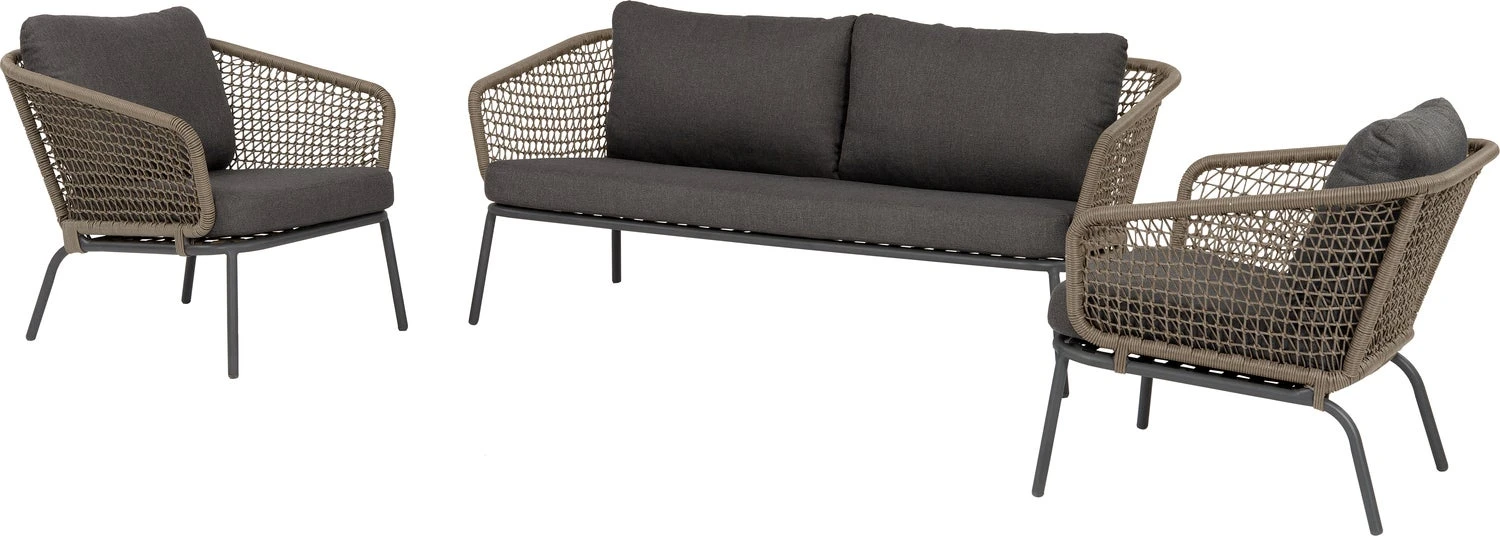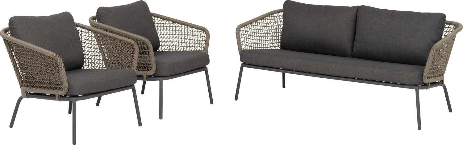 Loungeset Puck is 3-delig en bestaat uit een 2-zits loungebank, afmetingen 173,5 x 80 x 71 cm en twee loungestoelen, afmetingen 78,5 x 80 x 71 cm. Loungeset Puck wordt geleverd inclusief 7 comfortabele kussens in de kleur antraciet. Zithoogte 30,5 cm, 2 jaar garantie.