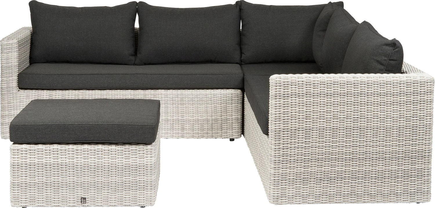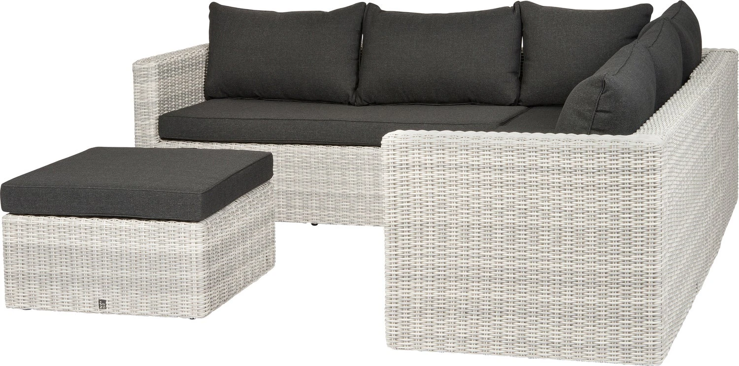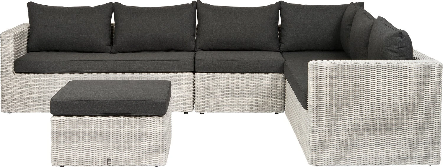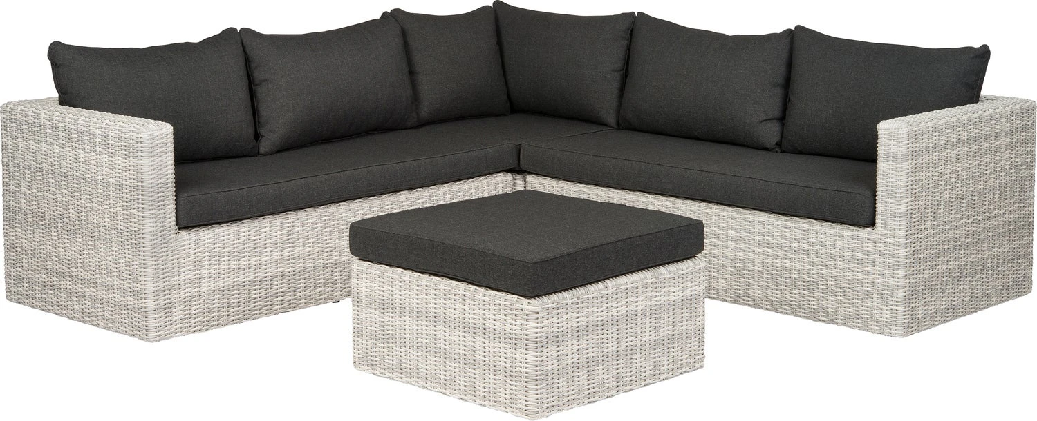 Loungeset Roma is 4-delig en bestaat uit een 2-zits loungebank links, afmetingen 151 x 81 x 64 cm, een 2-zits loungebank rechts, afmetingen 151 x 81 x 64 cm, een hoekstuk, afmetingen 81 x 81 x 64 cm en een loungetafel / hocker, afmetingen 68 x 68 x 33 cm. De Roma loungeset wordt geleverd inclusief goed gevulde kussens in de kleur zwart voor een optimaal zitcomfort. Zithoogte 32 cm, 2 jaar garantie.