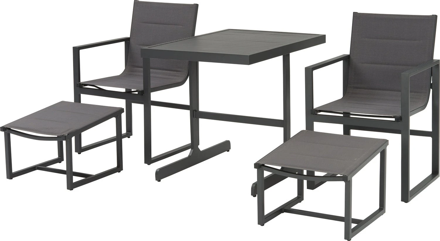 Bistroset Lizzy is 5-delig en bestaat uit een tafel, afmetingen 95,5 x 65 x 75 cm, twee stoelen, afmetingen 63 x 56 x 88,5 cm en twee voetenbanken, afmetingen 52 x 46 x 36 cm. Zithoogte 44 cm, garantie 2 jaar.