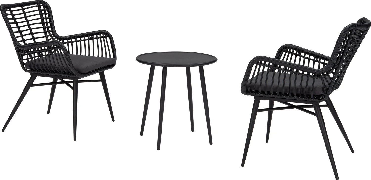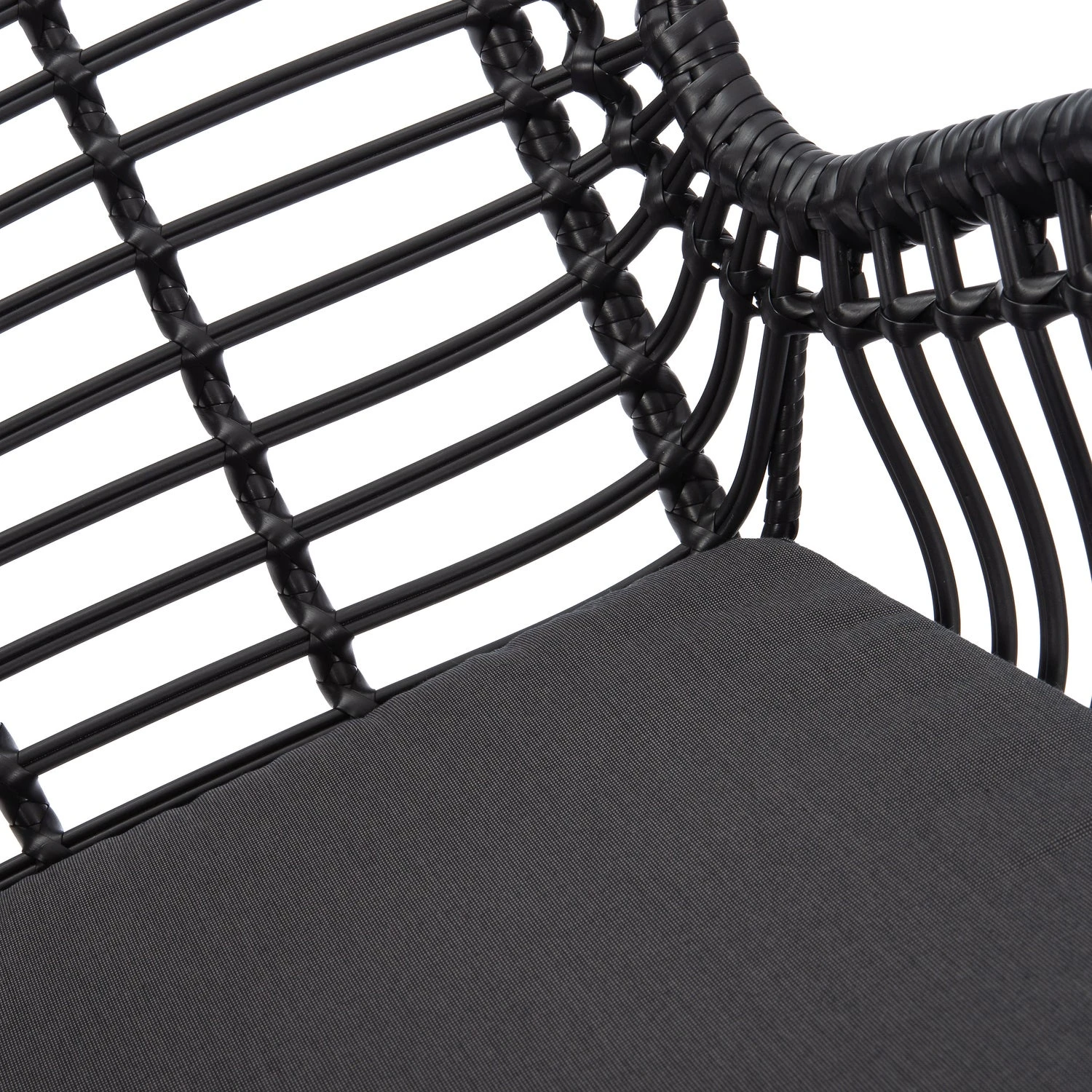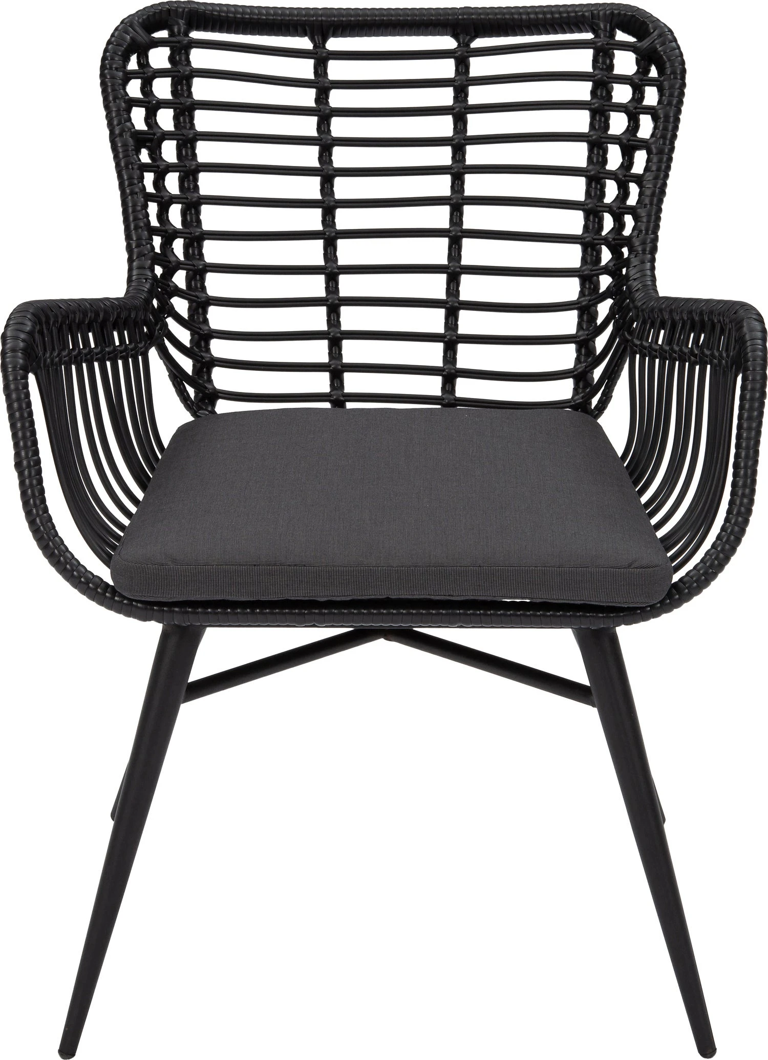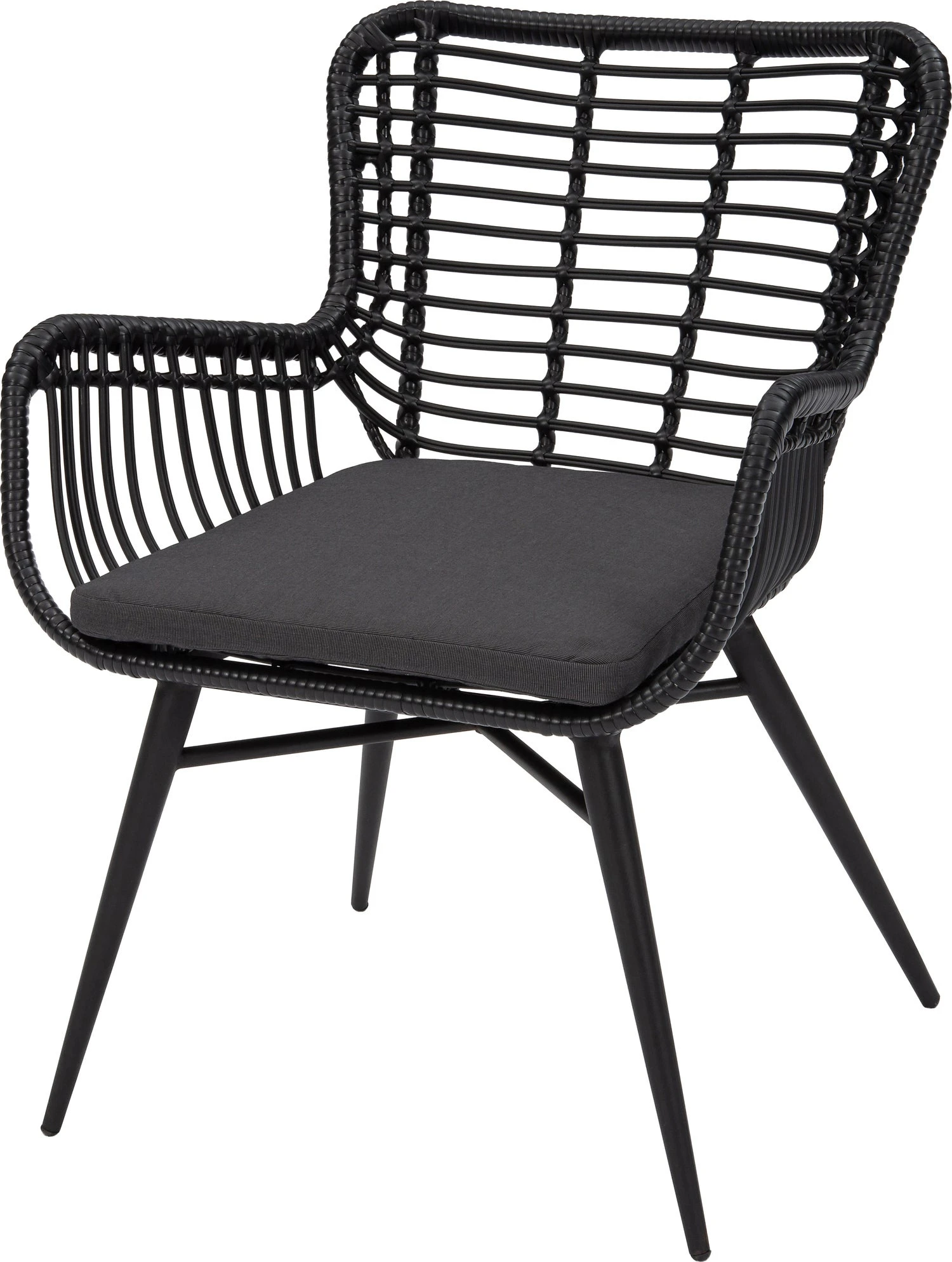 Eettafelstoel Bibi is fraai vormgegeven met een knipoog naar grootmoederstijd en vervaardigd uit een mat zwart gecoat frame van aluminium met een zitting van geweven wicker in de kleur zwart. Dit materiaal met de looks van natuurlijk riet of rotan staat bekend om zijn lange levensduur.