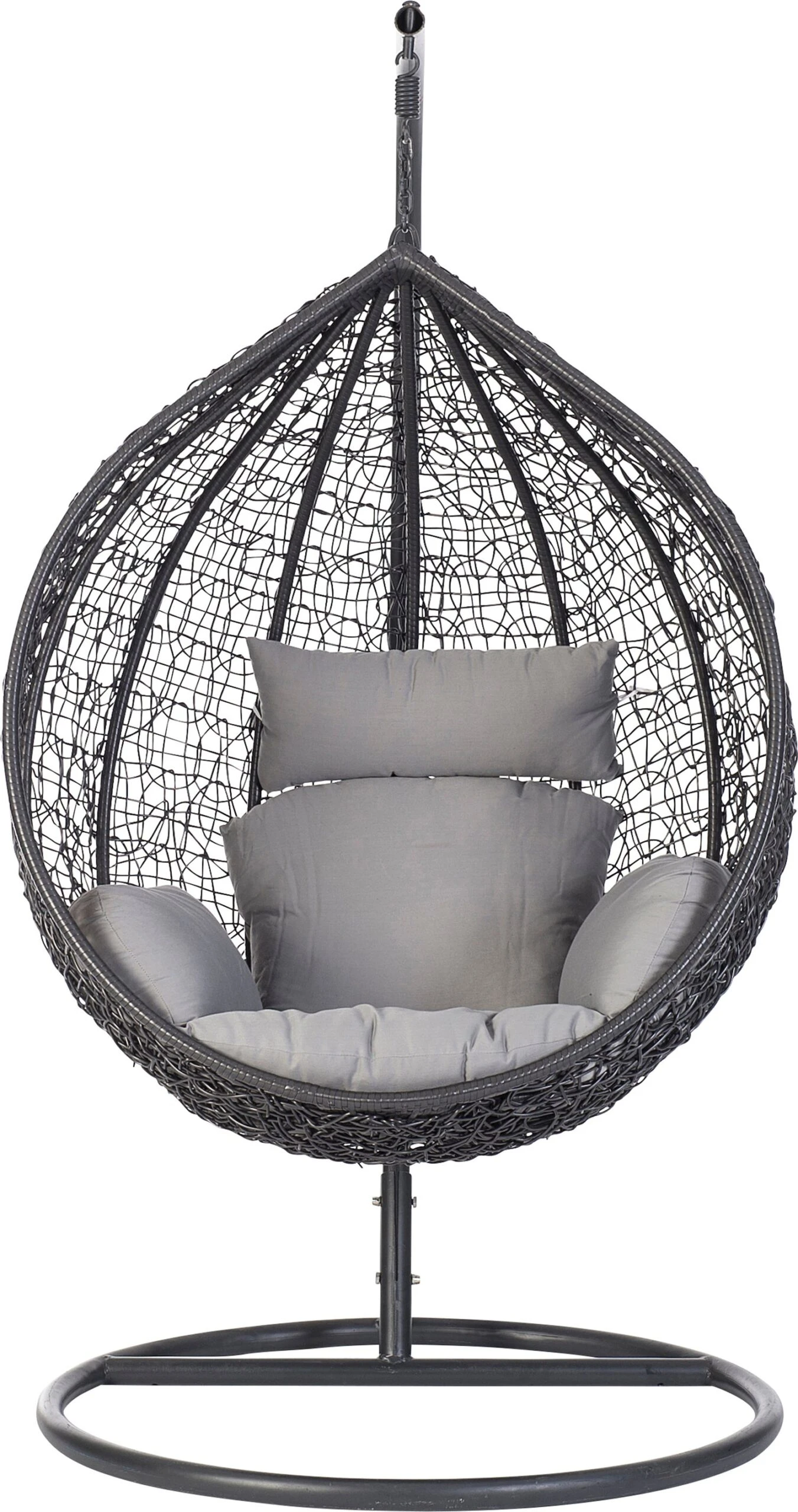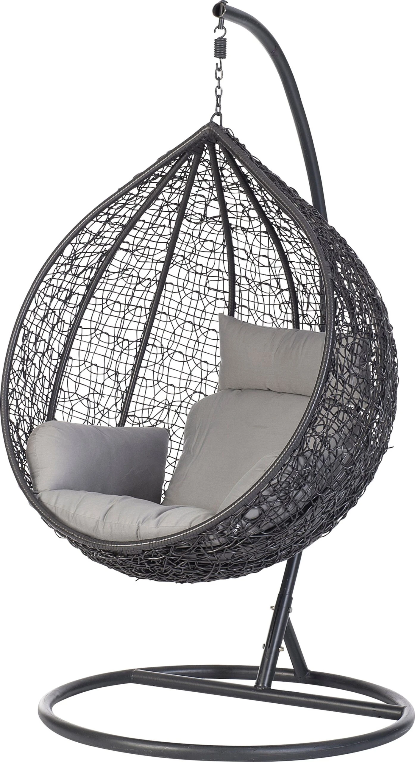 Een smaakvolle 1-persoons hangstoel van Intratuin in de kleur donkergrijs met trendy uitstraling. Deze set bestaat uit een stalen standaard met doorsnede van Ø 22 centimeter en een donkergrijze basket voor 1 persoon die is gemaakt van gevlochten wicker. Wicker is een kunststof dat ook wel bekend staat om zijn lange levensduur. Hoe fijn is dat! Hangstoel Inge wordt geleverd inclusief standaard en kussens.