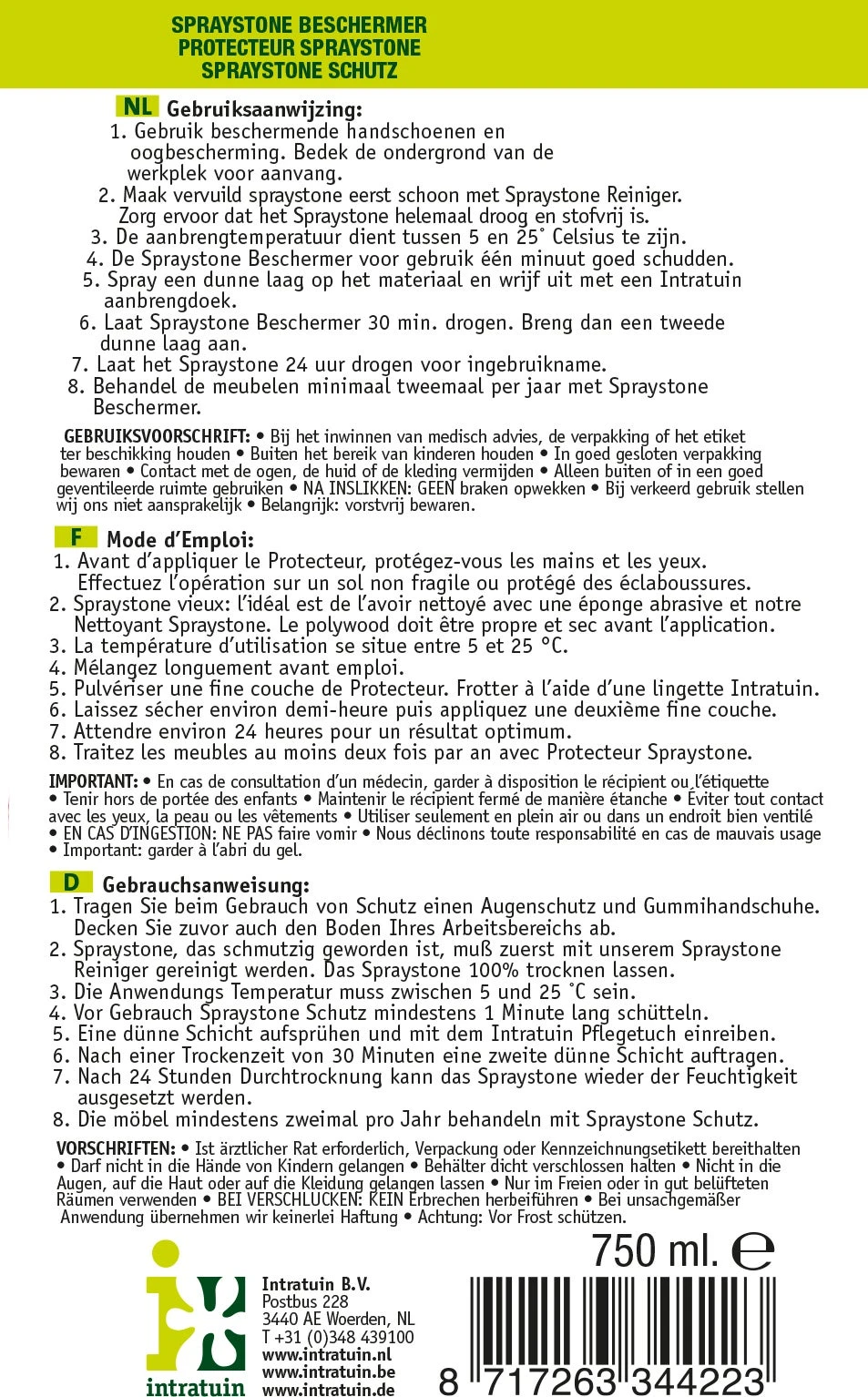 De spraystone / polycement beschermer van Intratuin zorgt voor een langdurige bescherming van je tuinmeubelen van spraystone en polycement materiaal. De beschermer maakt je tuinmeubelen water- en vuilafstotend. Het UV-block helpt een snelle verkleuring en veroudering van de materialen voorkomen.