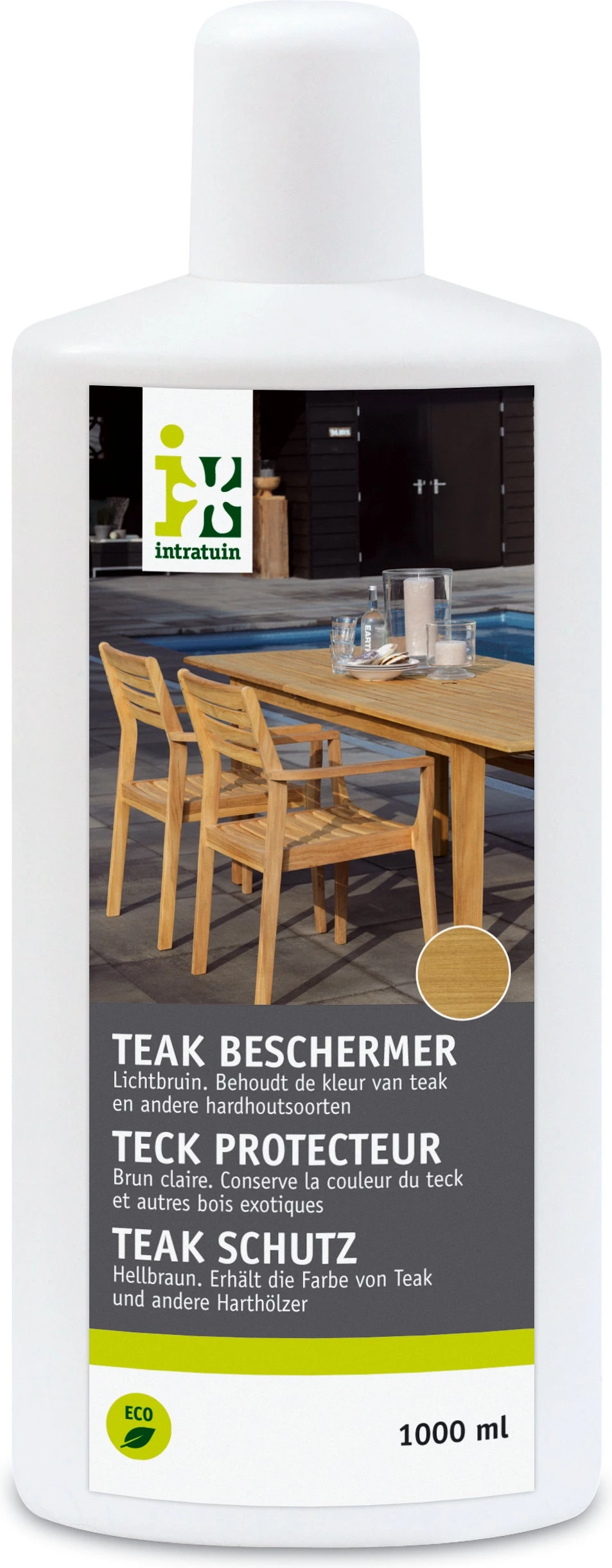 Intratuin teak beschermer is lichtbruin. Behoudt de kleur van teak en andere hardhoutsoorten. Inhoud 1000 ml.