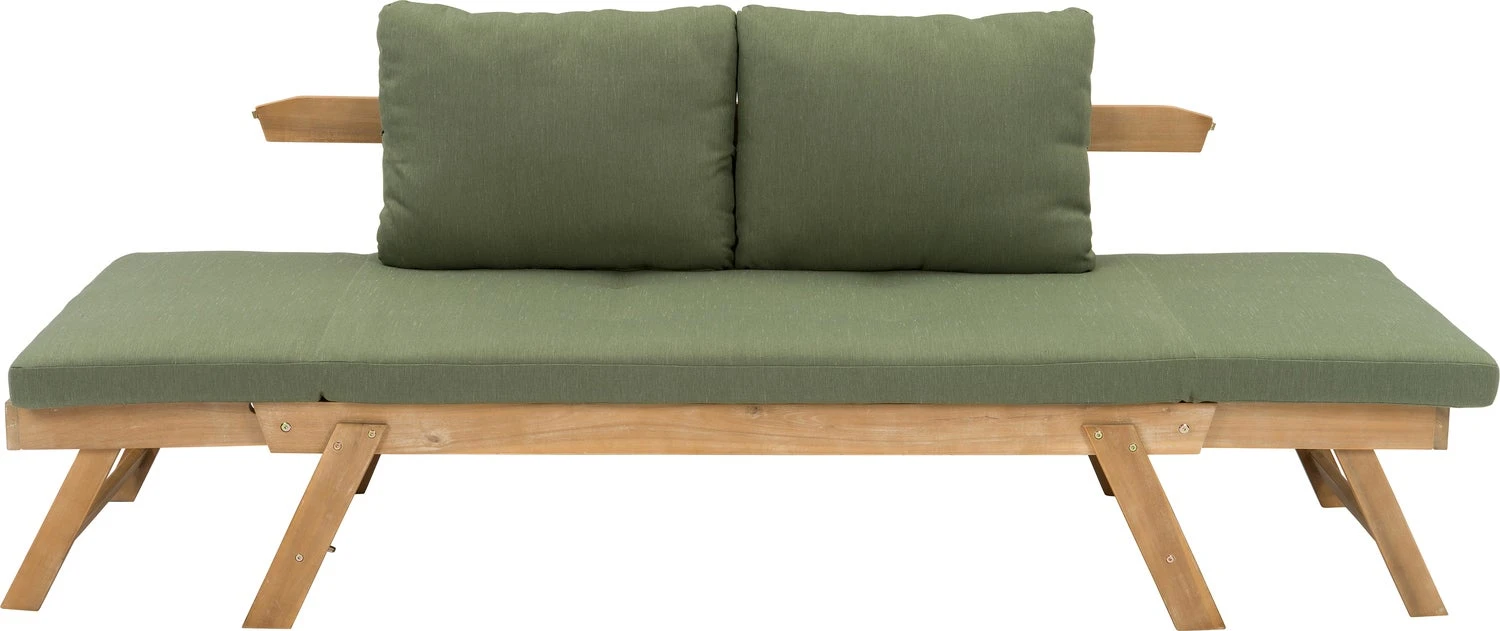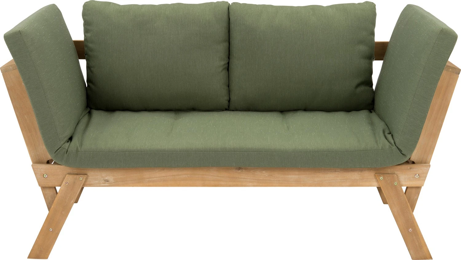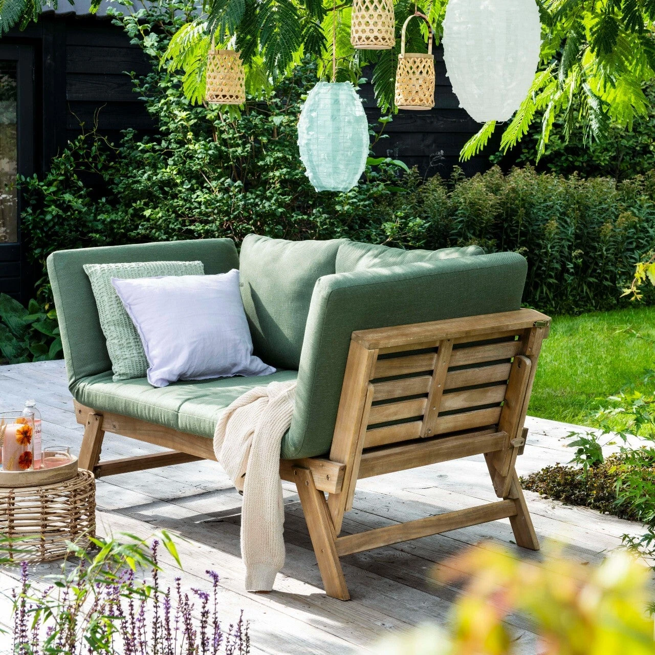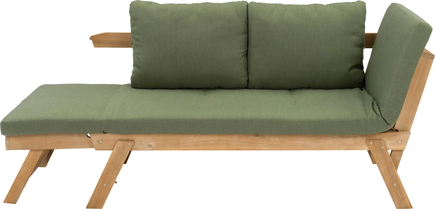 Buitenbank Lorient is gemaakt van duurzaam acacia hout en heeft de kleur bruin/naturel. De zijkanten zijn verstelbaar zodat je de bank eenvoudig kunt verstellen van buitenbank naar ligbed. De meegeleverde zit- en rugkussens in fris groen geven dit bankje een botanische uitstraling en zijn ook nog eens lekker dik wat zorgt voor een optimaal zitcomfort. Ontspannen hoeft niet moeilijk te zijn!