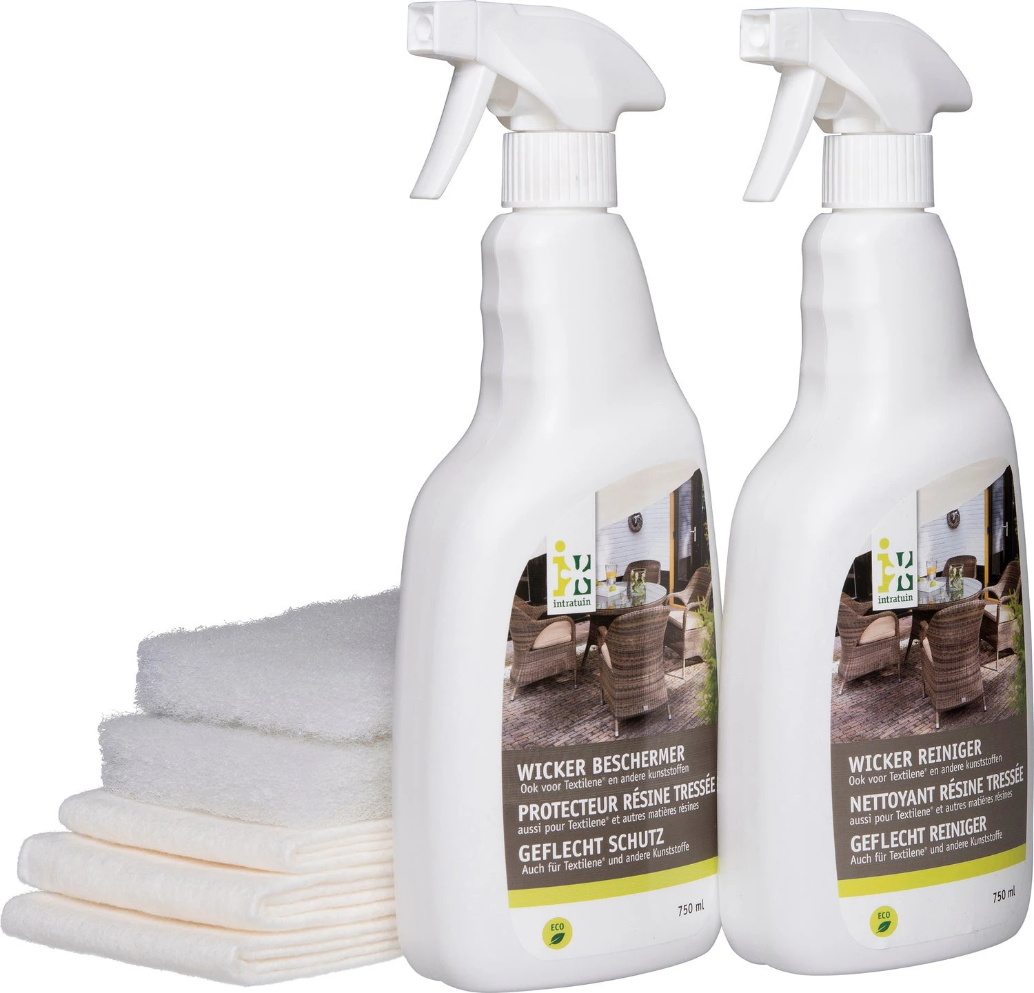 Dit wicker / textilene onderhoudspakket van Intratuin bestaat uit een wicker beschermer en een wicker reiniger. Het pakket wordt geleverd met 3 aanbrengdoeken en 2 schuursponzen.