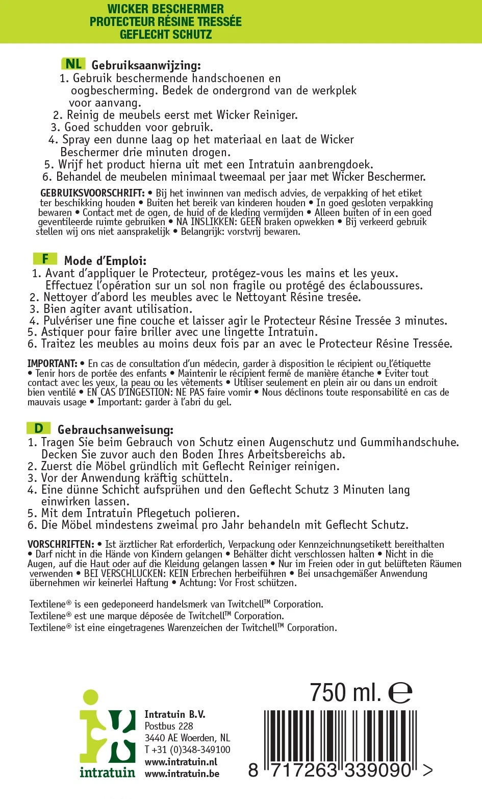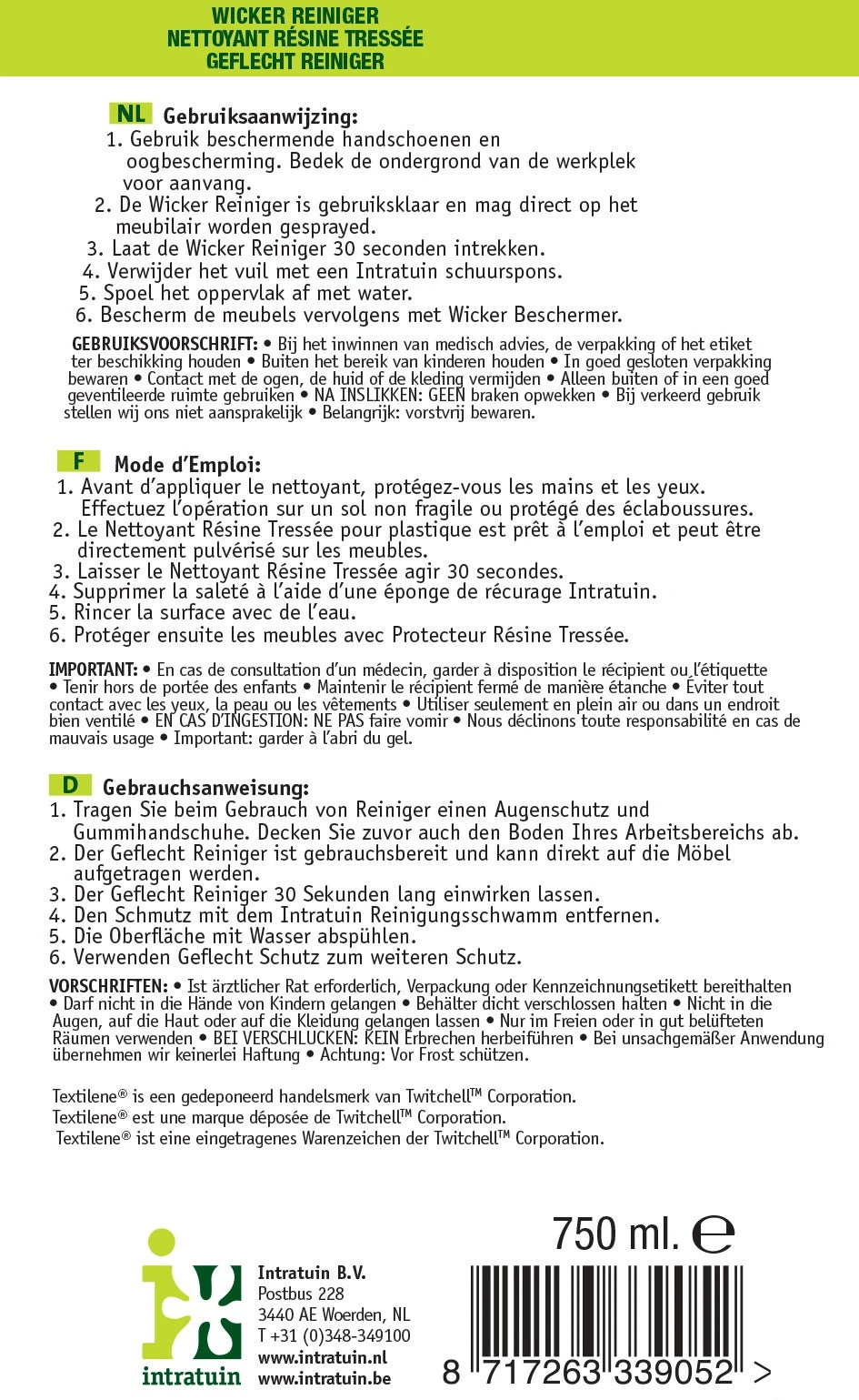 Intratuin wicker reiniger is een krachtige reiniger die snel en diepgaand vuil, vet en andere vlekken op vlechtwerk en textilene verwijdert. Het product schuimt niet waardoor wordt voorkomen dat er vettige zeepresten in de kleine gaatjes van het vlechtwerk of textileen achter blijven.