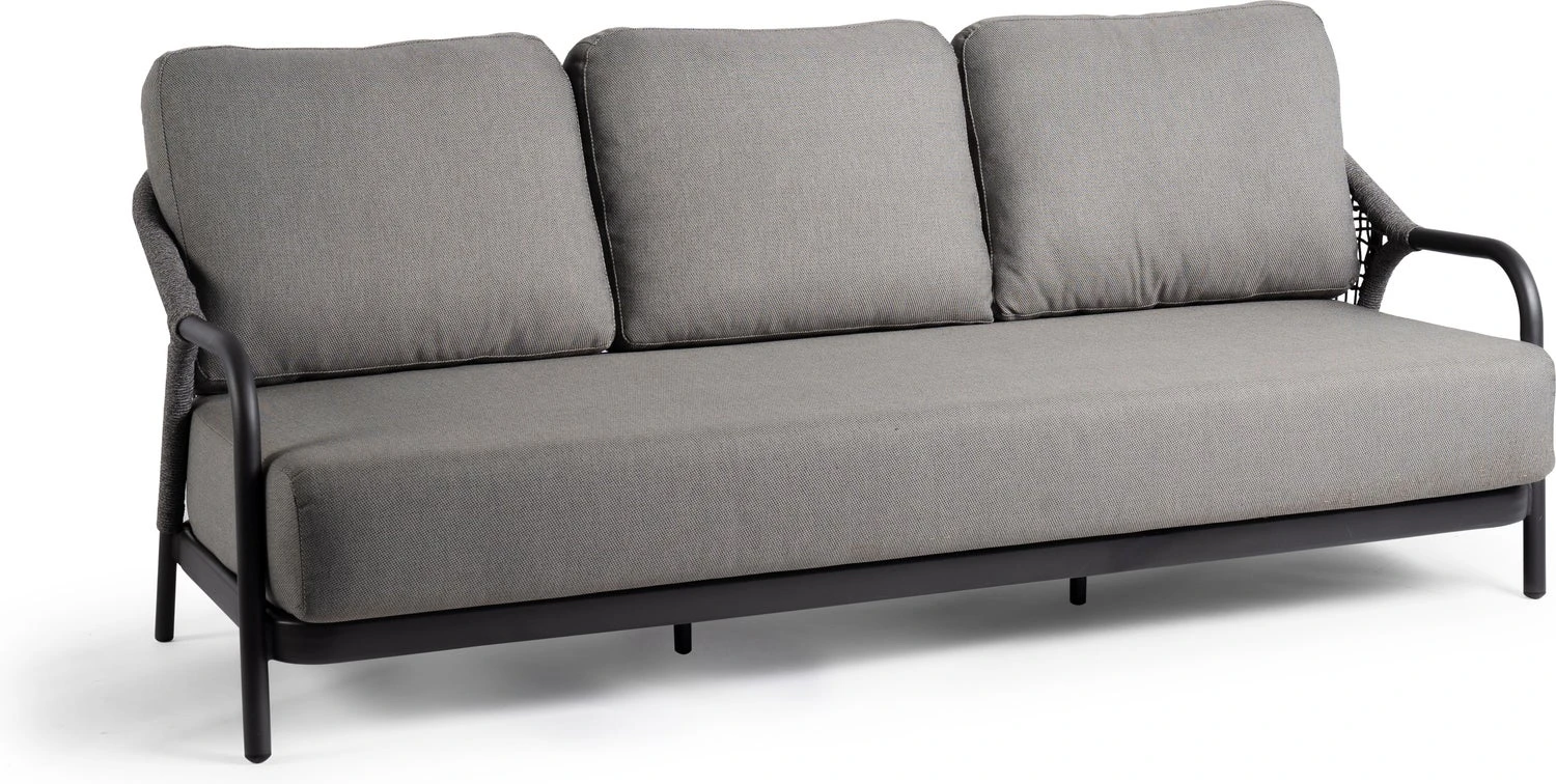 3-zits loungebank Fiona heeft de afmetingen 203 x 86,5 x 73,5 cm en wordt geleverd met all-weather Olefin kussens in de kleur grijs. Zithoogte 39 cm, 3 jaar garantie.