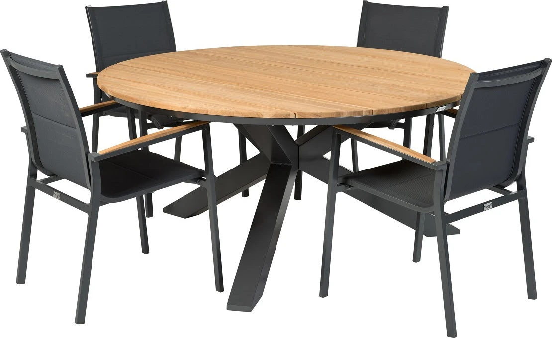 De Orbital met Foxx diningset van Tierra Outdoor vormt een goede toevoeging op het terras door het fraaie design en de hoogwaardige kwaliteit materialen. Deze 4-persoons tuinset is samengesteld uit tuintafel Orbital met 4 Foxx tuinstoelen die samen een natuurlijke sfeer uitademen. Eettafel Orbital haluminium frame in de kleur antraciet en een tafelblad van 100% FSC (Forest Stewardship Council) gekeurd teakhout in de kleur naturel. De tuintafel is lekker licht van gewicht door het aluminium onderstel dat is afgewerkt met een beschermende poedercoating.