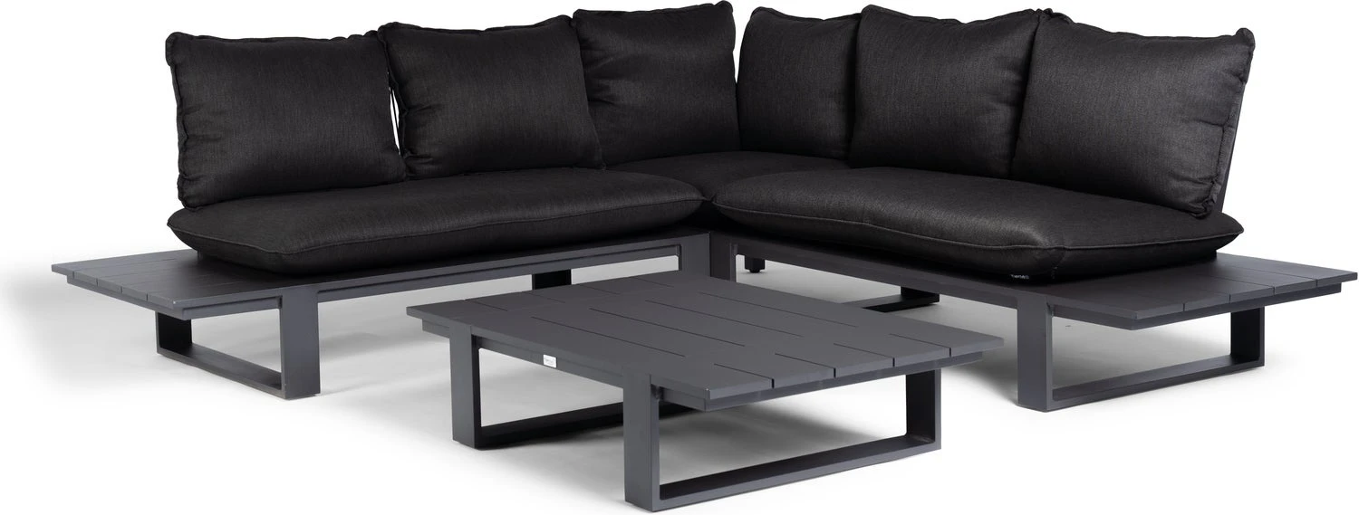 Deze 4-zits loungeset maakt onderdeel uit van de serie Dawson, maar kan door zijn neutrale uitstraling ook goed gecombineerd worden met andere tuinmeubelen. De 4-zits bank van Dawson is een luxe, comfortabele buitenbank met een eigentijdse uitstraling door het strakke design in de kleur antraciet en met lekkere grote kussen voor optimaal loungegenot. Deze 5-zitsbank bestaat uit een complete loungeset en een loungetafel.