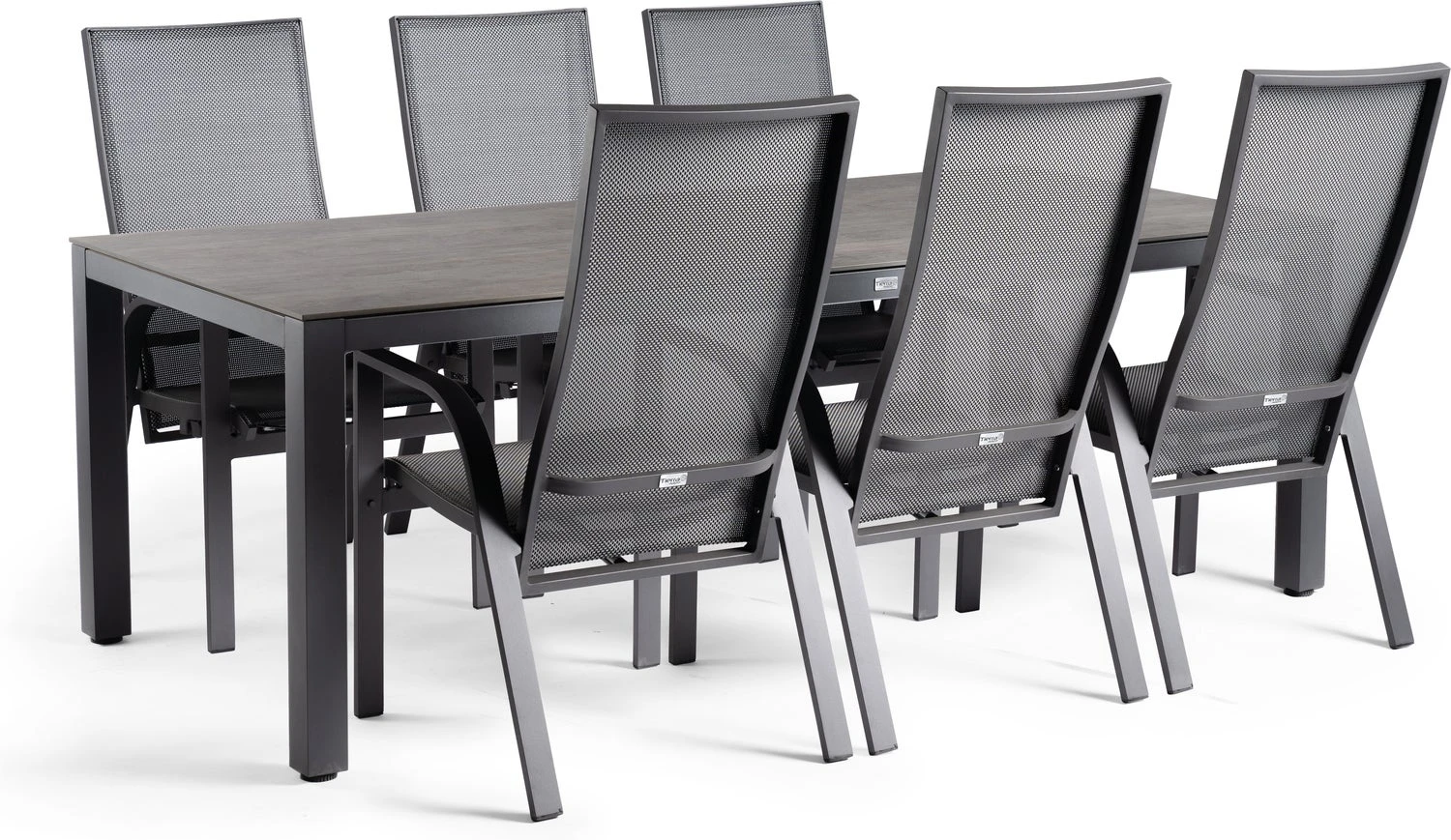 Diningset Briga met Edo is 6-delig en bestaat uit eettafel Briga, afmetingen 240 x 100 x 73 cm en vier verstelbare Edo eettafelstoelen, afmetingen 62 x 60 x 113 cm. Zithoogte 44,5 cm. Tuintafel Briga is eenvoudig zelf te monteren aan de hand van de meegeleverde instructie.