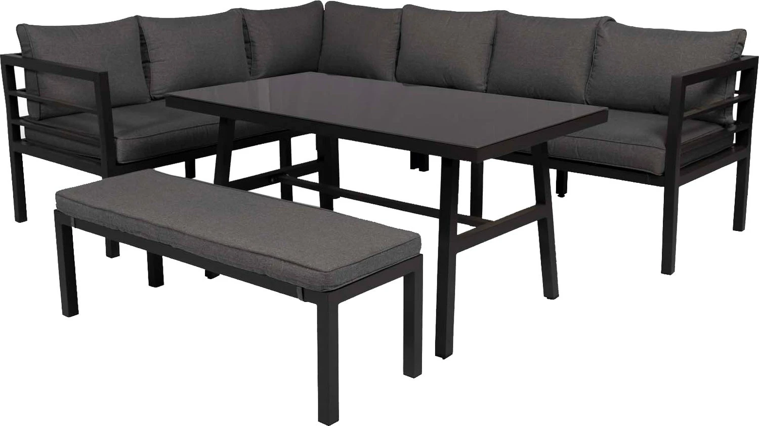 De set bestaat uit twee banken die je aan elkaar kunt monteren, een los bankje en een hoge tafel waarop het heel erg goed toeven en tafelen is. De glasplaat op de tafel is gehard, dus ziet er extra stylish uit. Loungen in je tuin heeft er nog nooit zo aantrekkelijk uitgezien!