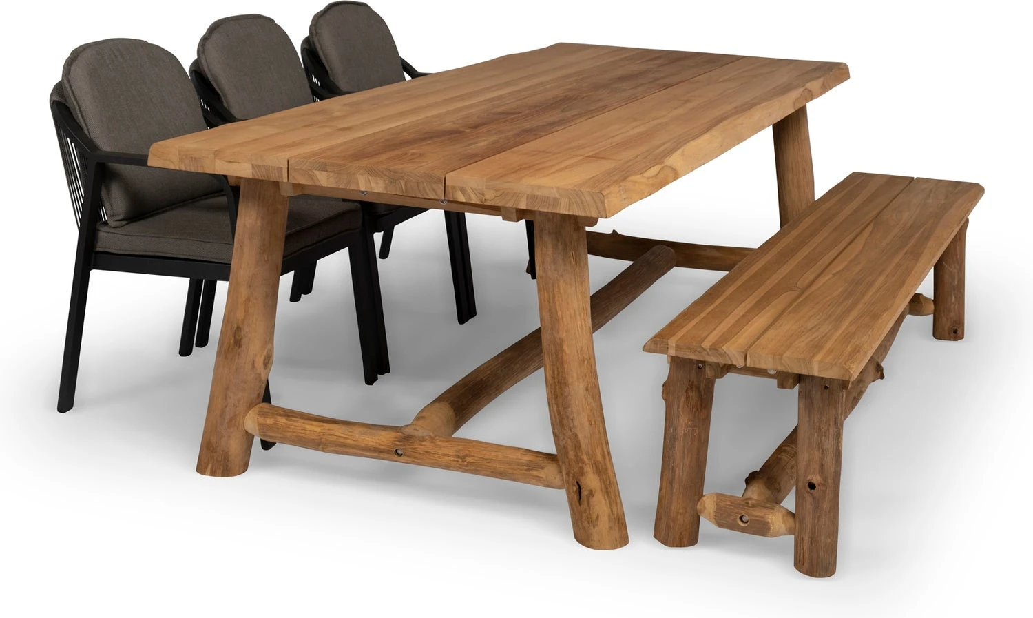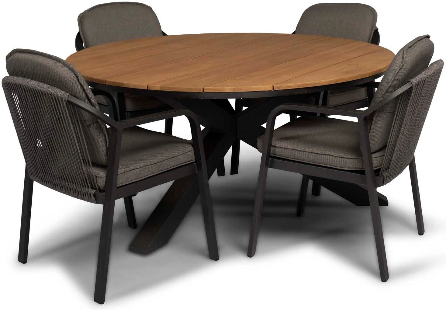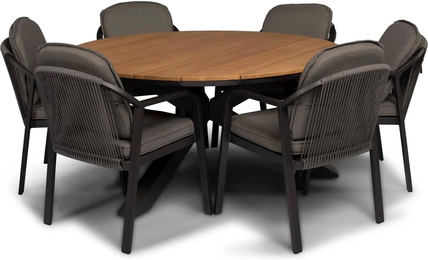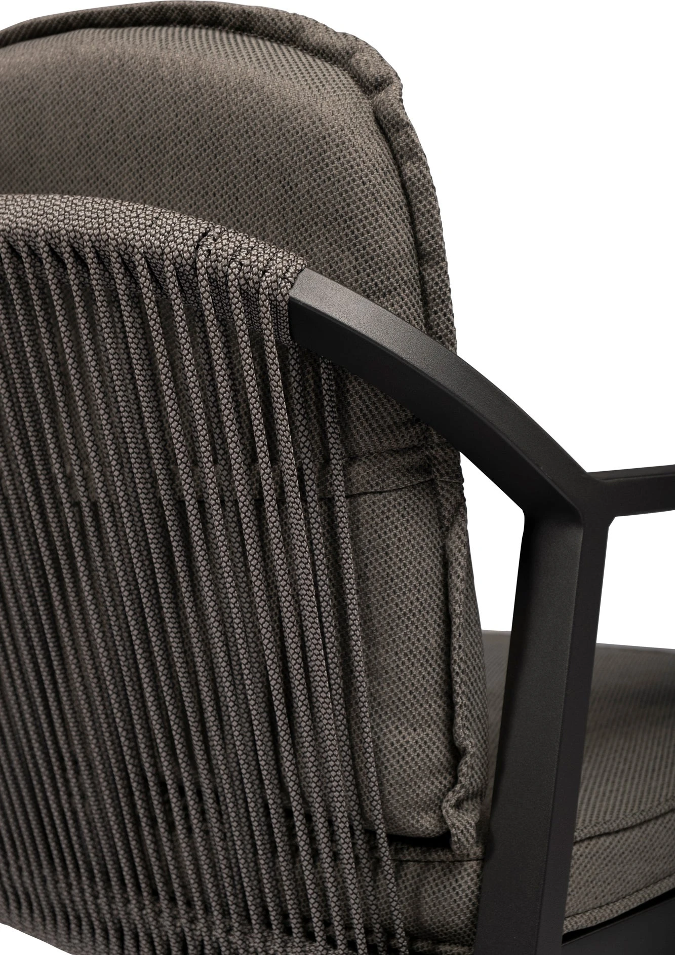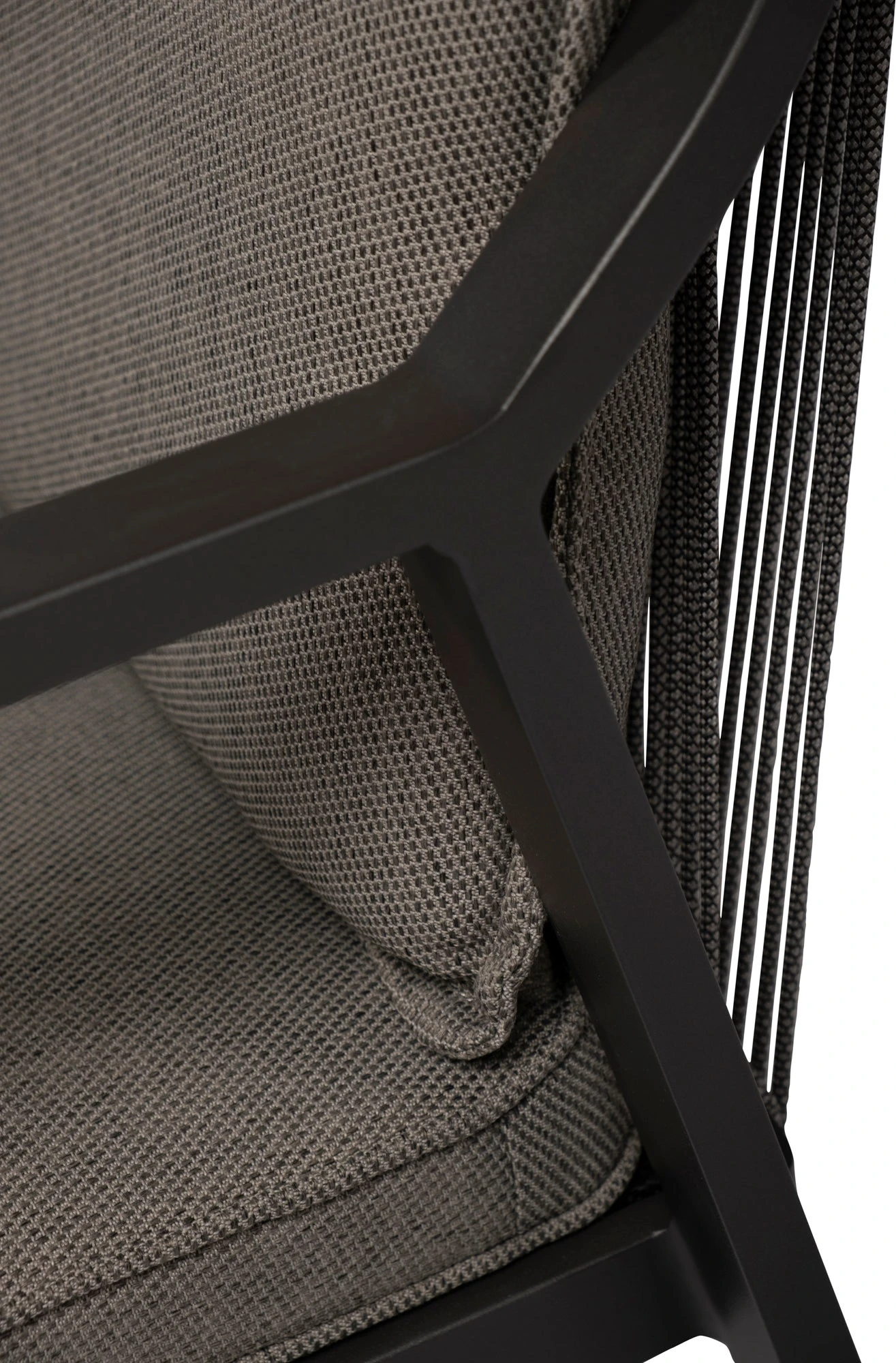 Dit touw is speciaal ontwikkeld voor buitengebruik en bevat een oersterke synthetische vezel die je naast de stevigheid ook steeds vaker terug ziet komen in de tuin door het hoge decoratiegehalte. De luxe “all weather” kussens worden meegeleverd en zijn grijs van kleur.