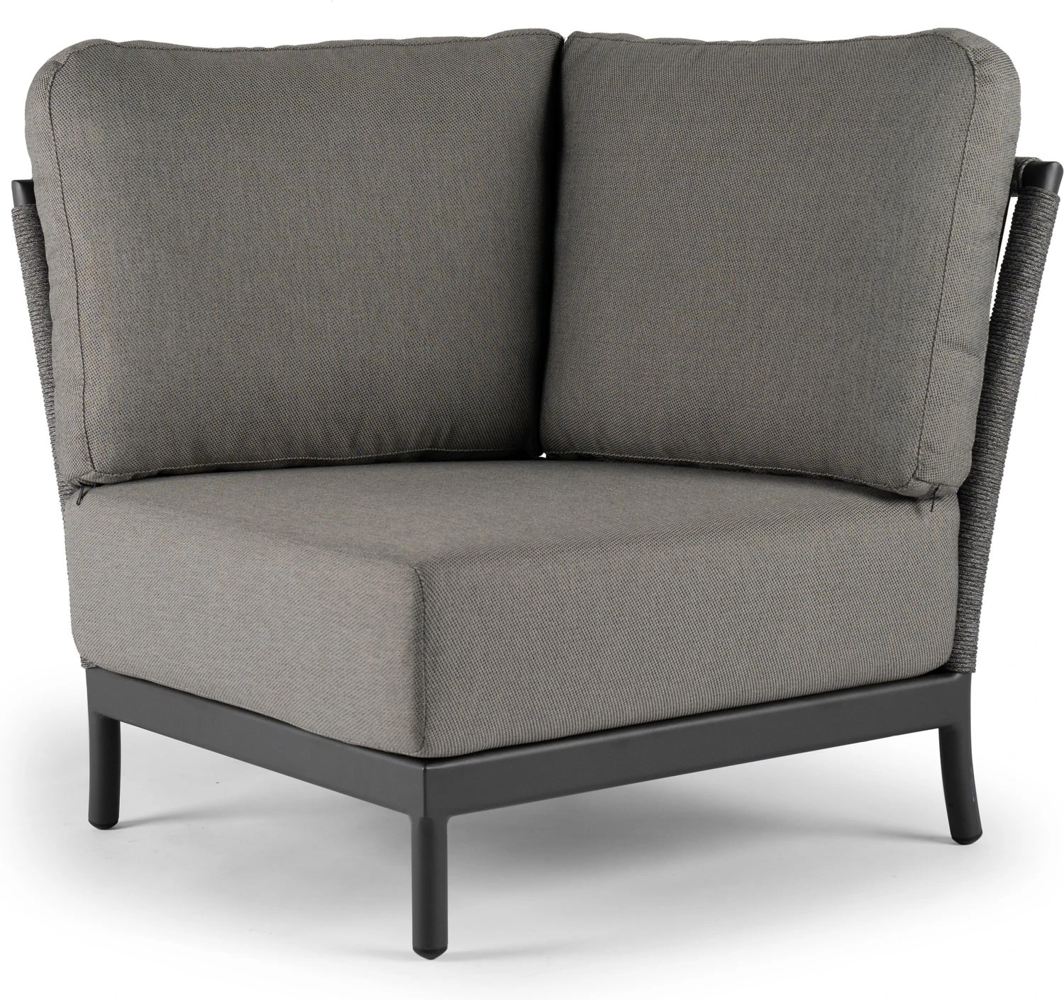 Het hoekstuk heeft een aluminium frame, waardoor deze lichtgewicht en makkelijk te verplaatsen is. Het frame is afgewerkt met een charcoal AkzoNobel poedercoating en heeft een mooie verticale semi-doorkijk van rope in de rugleuning. De all-weather Olefin kussens zorgen voor optimaal zitcomfort en kunnen het hele jaar buiten blijven liggen.
