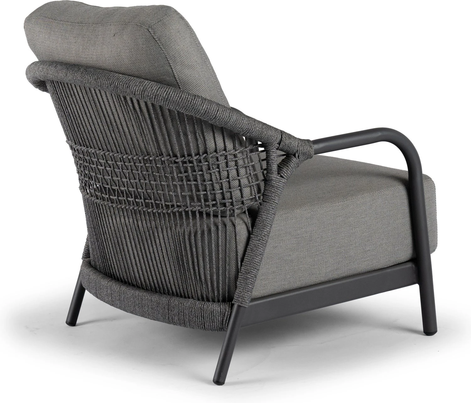 De Fiona loungestoel heeft een aluminium frame, waardoor de stoel lichtgewicht en makkelijk te verplaatsen is. Het frame is afgewerkt met een charcoal AkzoNobel poedercoating. De loungestoel heeft een mooie verticale semi-doorkijk van rope in de rugleuning. De all-weather Olefin kussens zorgen voor optimaal zitcomfort en kunnen het hele jaar buiten blijven liggen.