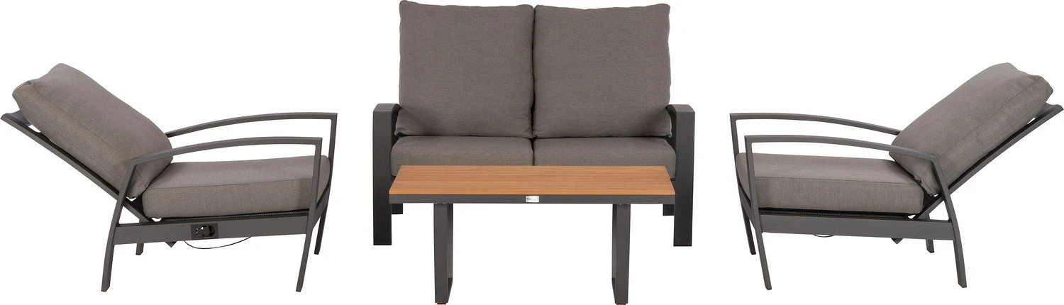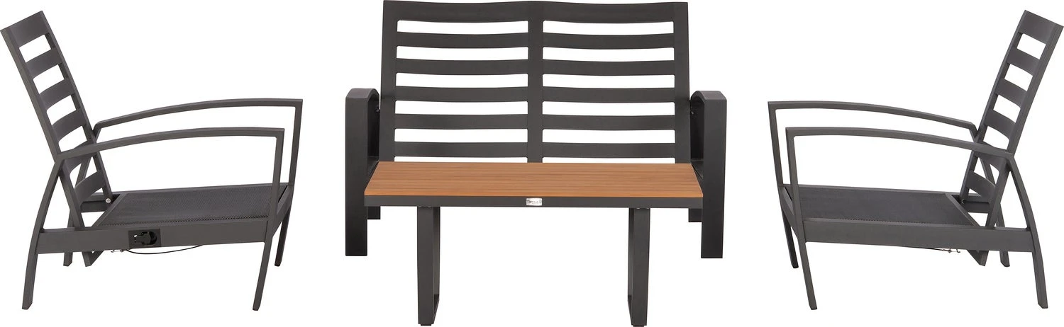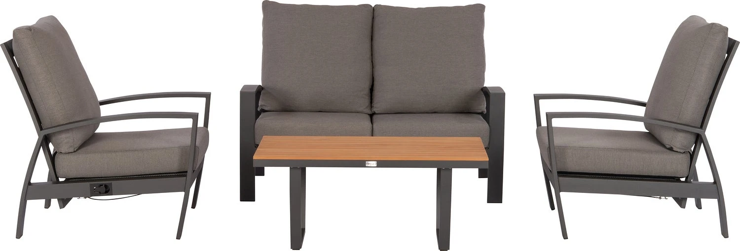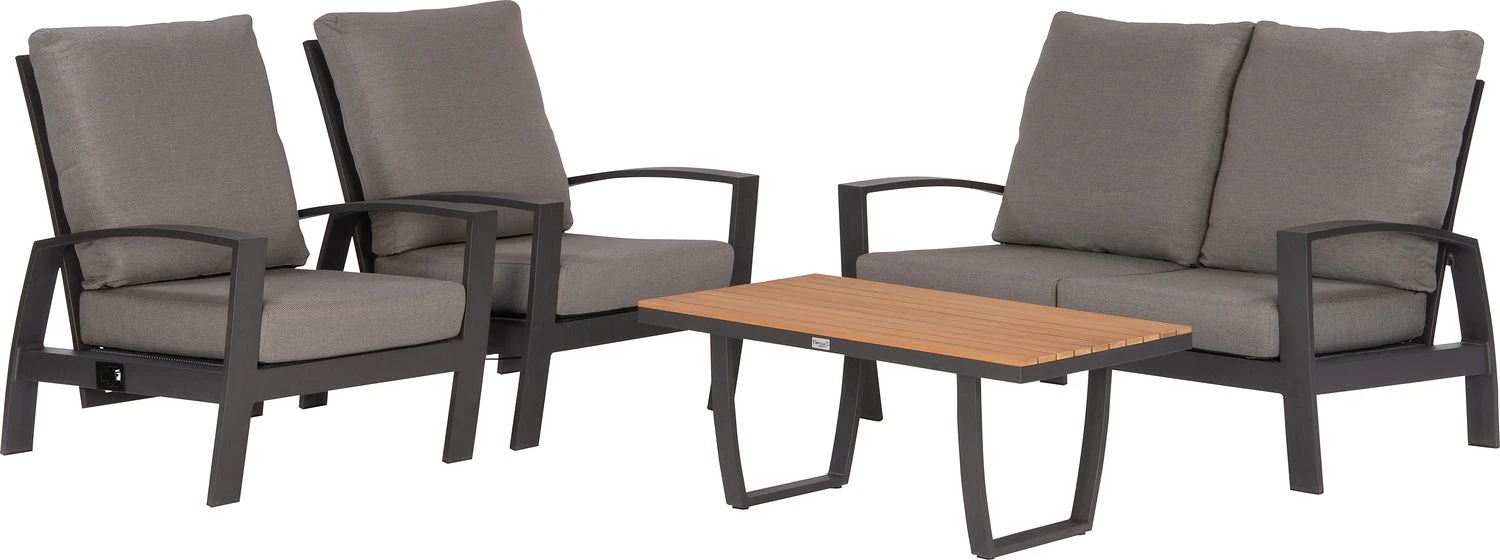 Loungeset Valencia is 4-delig en bestaat uit een 2-zits loungebank, afmetingen 93 x 138 x 88 cm, 2 verstelbare loungestoelen, afmetingen 93 x 77 x 88 cm en een loungetafel, afmetingen 105 x 60 x 45 cm. Deze Valencia loungeset wordt geleverd met 8 stevige en 95% waterafstotende kussens in de kleur grijs. Zithoogte 43 cm, 3 jaar garantie.